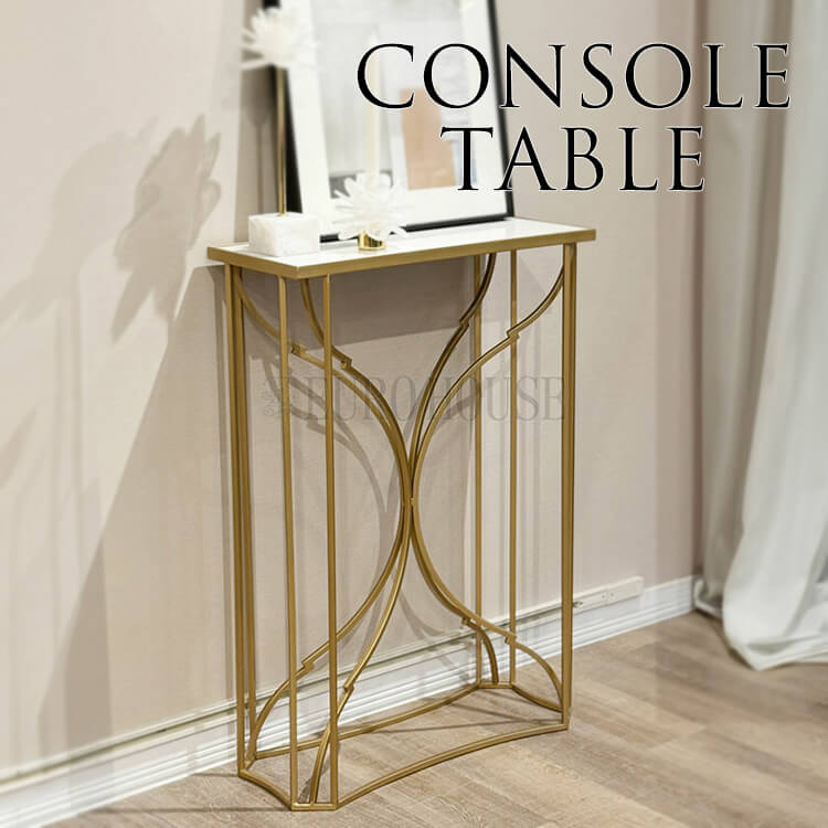 アンティーク調のゴールドフレームと人造大理石の天板が高級感漂うモダンなコンソールテーブルです。