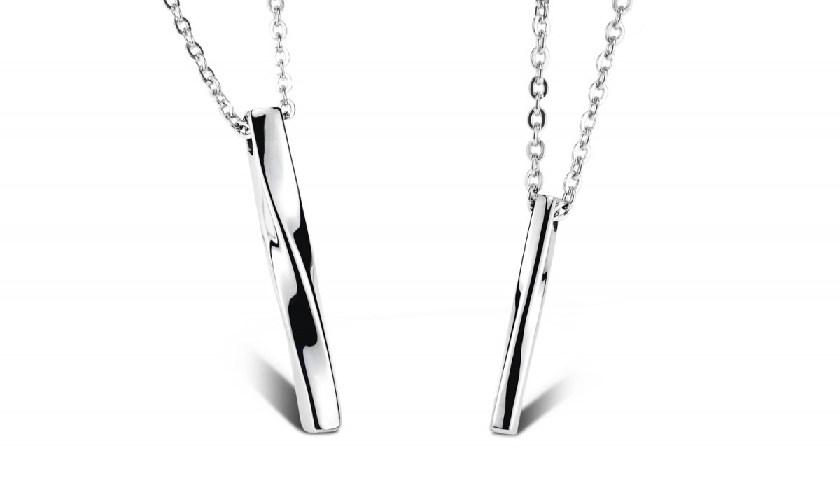 スティックがツイストしたデザイン。見る角度によって光の反射具合が変わり、まるでペンダントの形も変わるように見えます