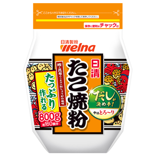 ロングセラーの「日清 たこ焼粉」のたっぷり作れる800gタイプです。