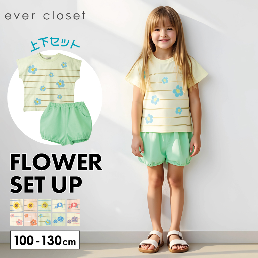 セットアップ 半袖 tシャツ ティーシャツトップス ボトムス ズボン パンツ ショート 通園通学 入園入学 普段使い お出かけ 遠足 旅行 帰省 修学旅行 プレゼント 誕生日 school 綿100% コットン100% おしゃれ お洒落 オシャレ かわいい 可愛い カワイイ カジュアル プチプラ ぷちぷら ゆったり 涼しい お揃い 友達 友だち 柄 総柄 花柄 ひまわり ヒマワリ あじさい アジサイ ハイビスカス アサガオ あさがお 女の子 女児 ガールズ 子供服 こどもふく キッズ スクール ジュニア ベビー べびー 幼児 幼稚園 保育園 小学生 小学校 春夏 25SS アイボリー ピンク グリーン ラベンダー ブルー エバクロ evercloset