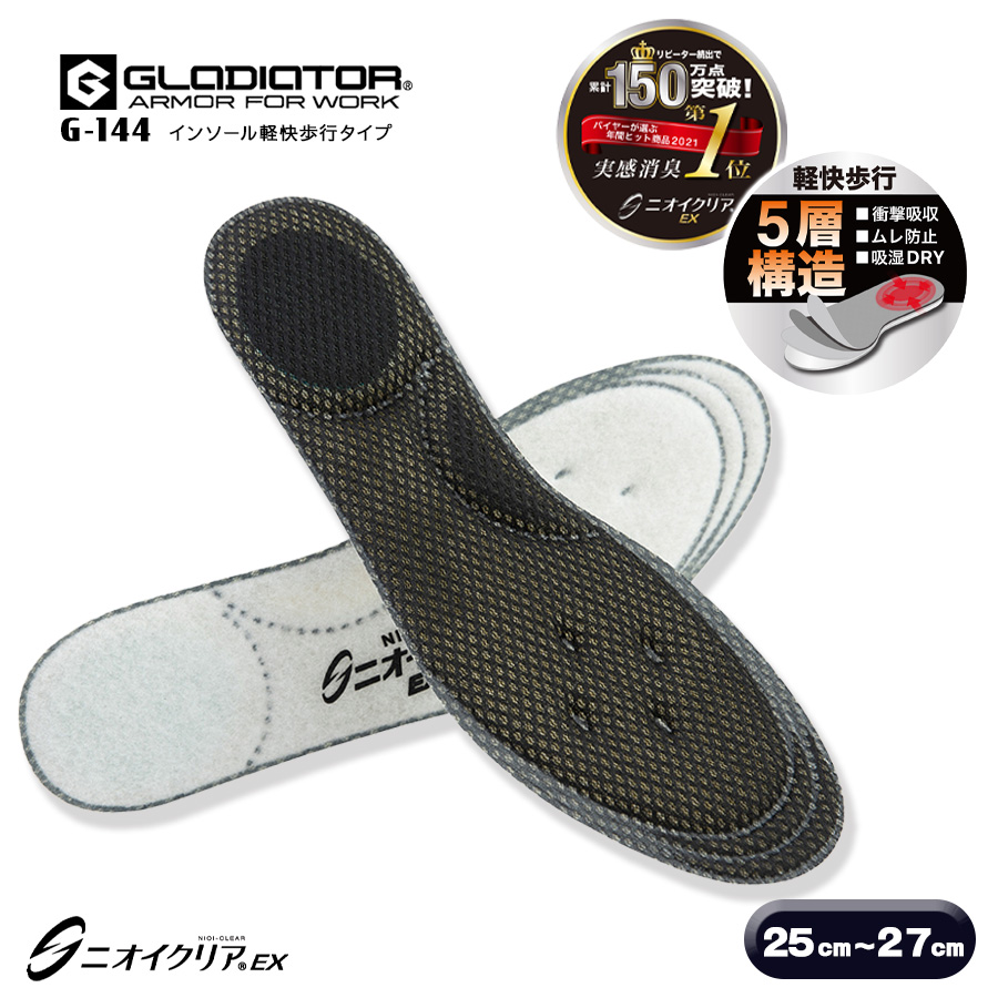 | 商品説明 | GLADIATOR グラディエーター G-144 ニオイクリア®インソール 軽快歩行タイプ 靴のニオイ「も」実感消臭! 150万点売れたニオイクリア®シリーズのインソール。 衝撃吸収素材のアクリル発砲体が、かかとへの衝撃を吸収。 ひざ・腰への負担を軽減します。 ニオイクリア®Wラッセルの実感強力消臭が凄い。 ・衝撃吸収 ・ムレ防止 ・吸湿DRY |