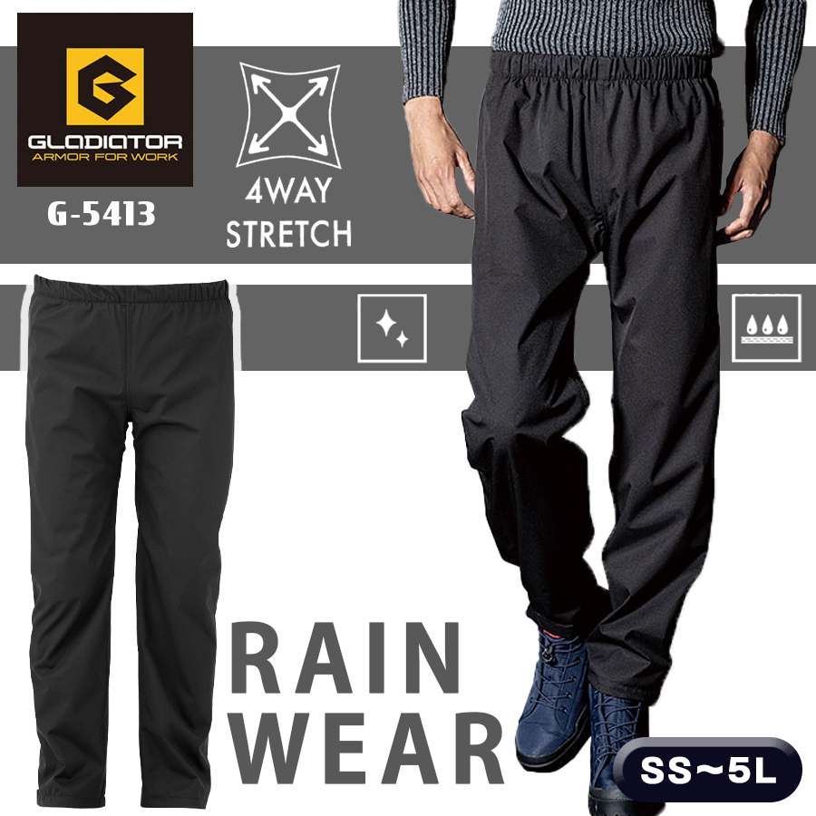 | 商品説明 | GLADIATOR グラディエーター G-5411シリーズ G-5413 4WAYストレッチレインパンツ G-GAIA® レインウェアとしての耐水圧・透湿性はクリア! 機能性はそのままにタウンユースでも着られるかっこいいシルエットに仕上げました。 軽快な着こなしを楽しめる新しいレインウエアです。 タテ・ヨコにストレッチ性のある4WAYストレッチ素材を採用。 快適な伸縮性で脚の動きをスムーズにサポートします。 TPUコーティングで防水性にも優れます。 ヒザ裏の反射テープにより、夜間・暗所で視認性が向上します。 ・ウエストゴム ・ウエストコード付き ・シームレス立体ヒップ セットアップ商品:5411 レインジャケット |