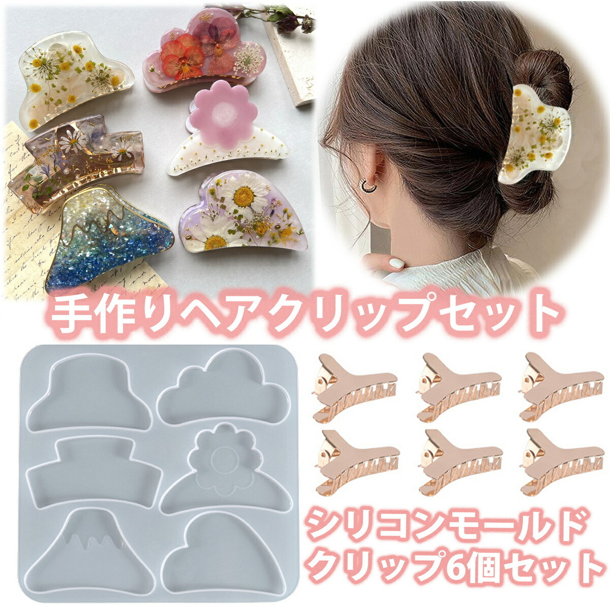 オリジナルのヘアクリップが作れるシリコンモールドとクリップのセットです。6種類のかわいいデザインでオリジナルのヘアクリップが作れます。付属のクリップは6個です。