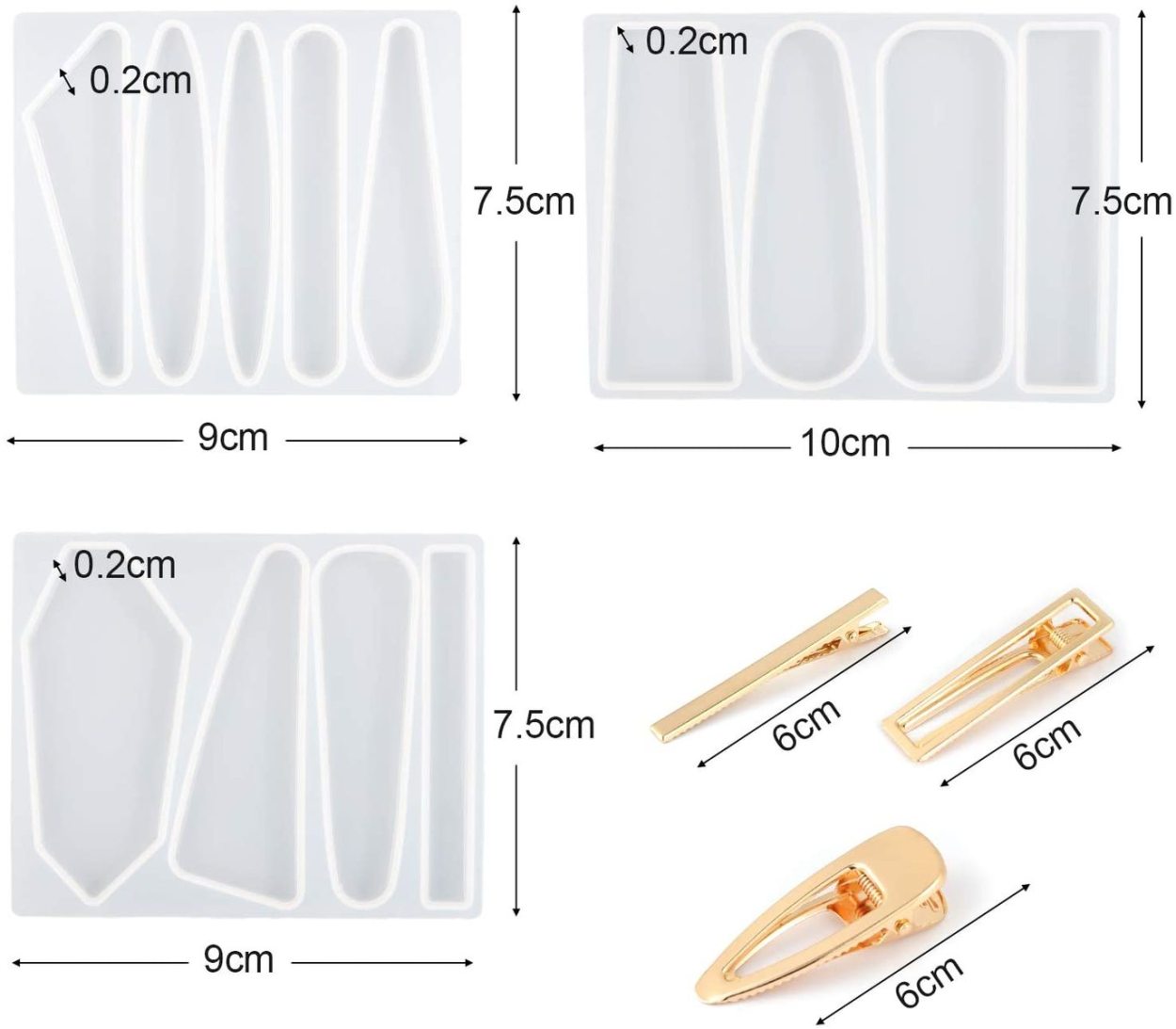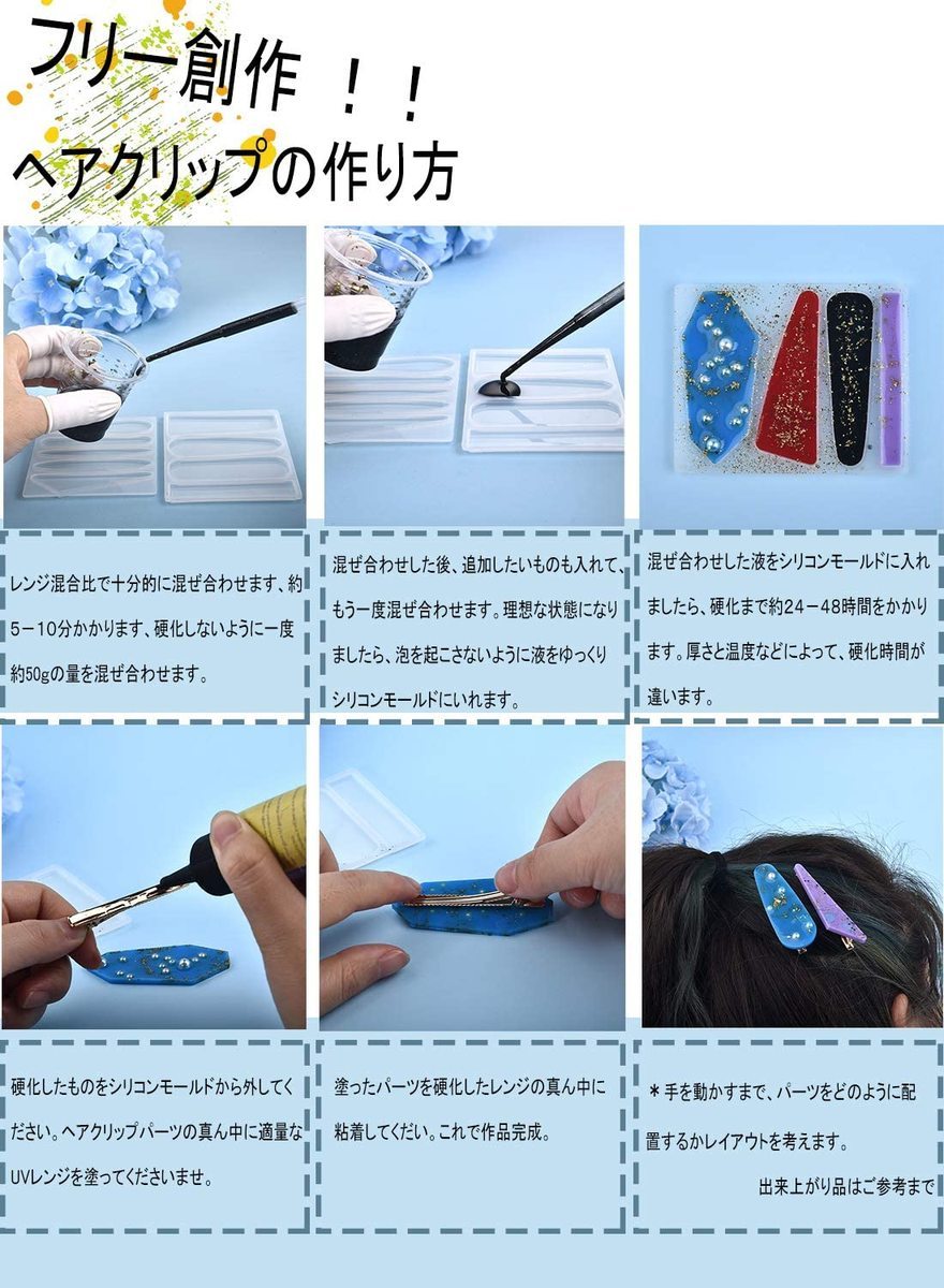 ヘアクリップのシリコンモールド3個と3種類の金具クリップ(各4個ずつ・合計12個)がセットになった商品です。