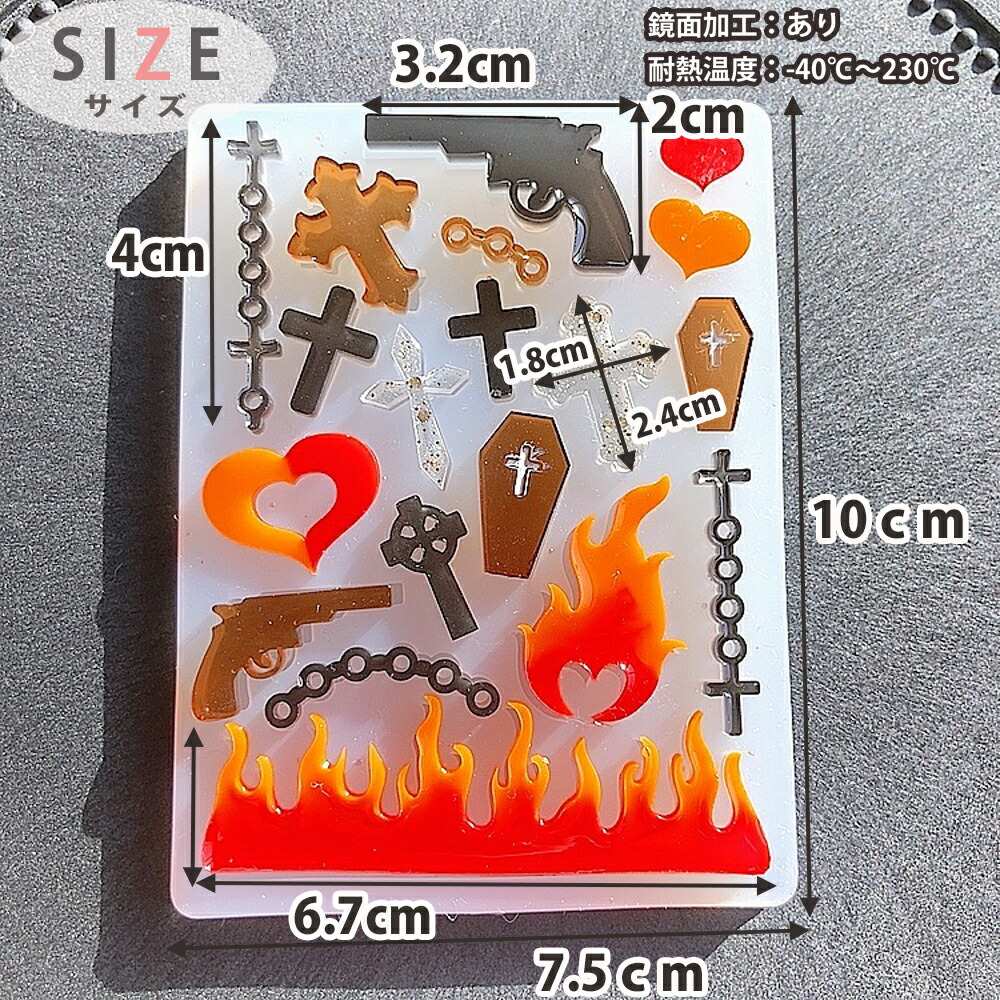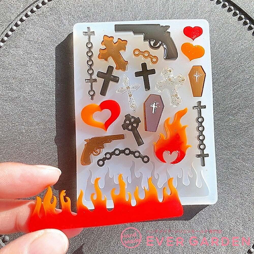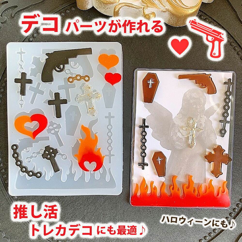 ピストルやハート、クロス、炎などのパーツが作れるシリコンモールドです。オタ活・推し活のグッズ作りやトレカデコにも最適です♪ ハロウィーンにもピッタリなユニークなデザインです。 UVレジン、エポキシ樹脂、樹脂粘土などにご利用いただけます。