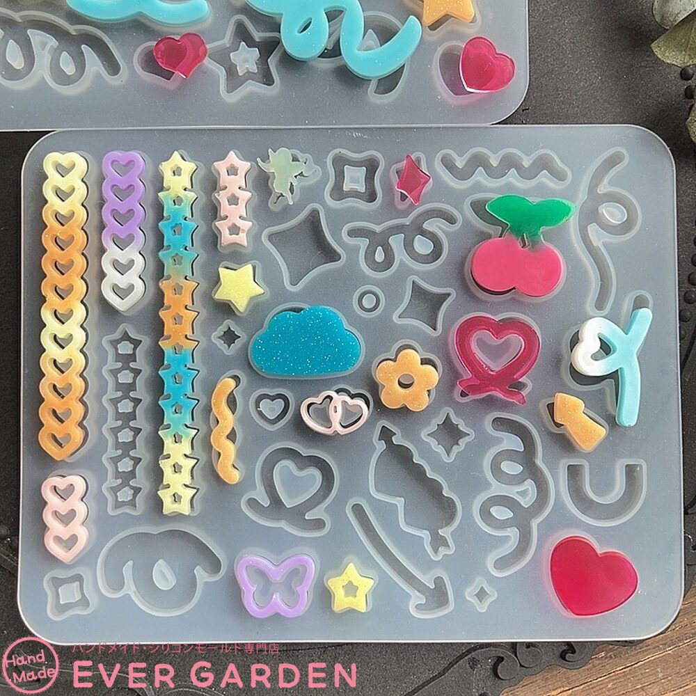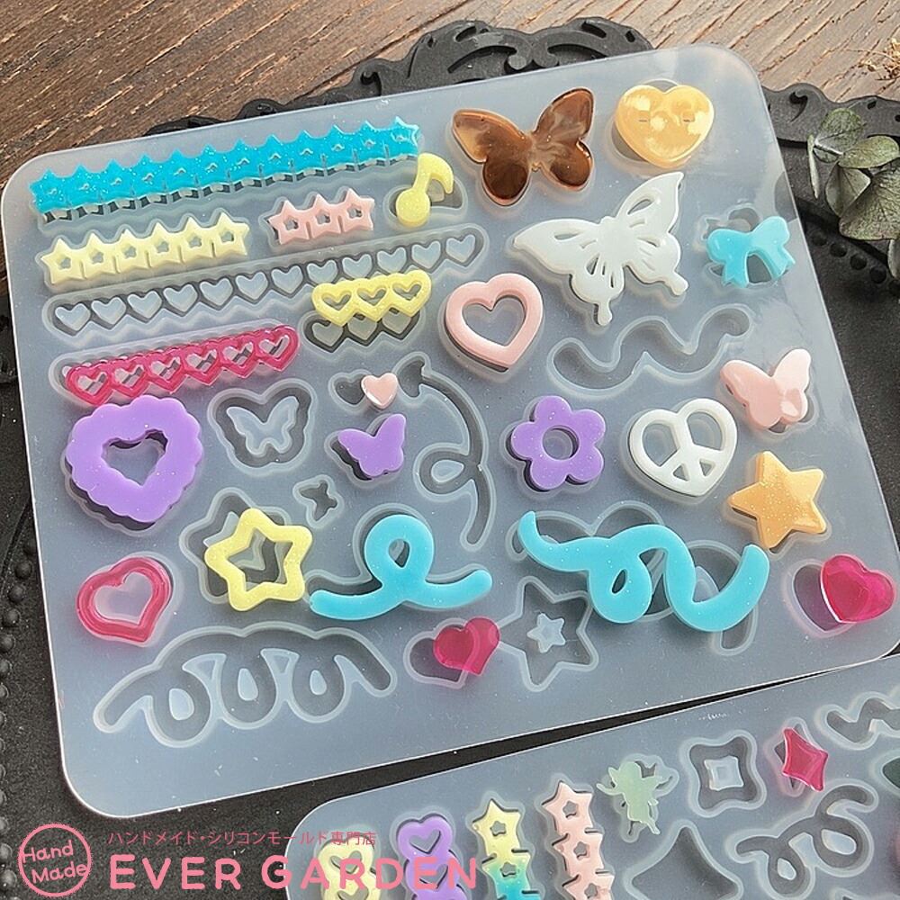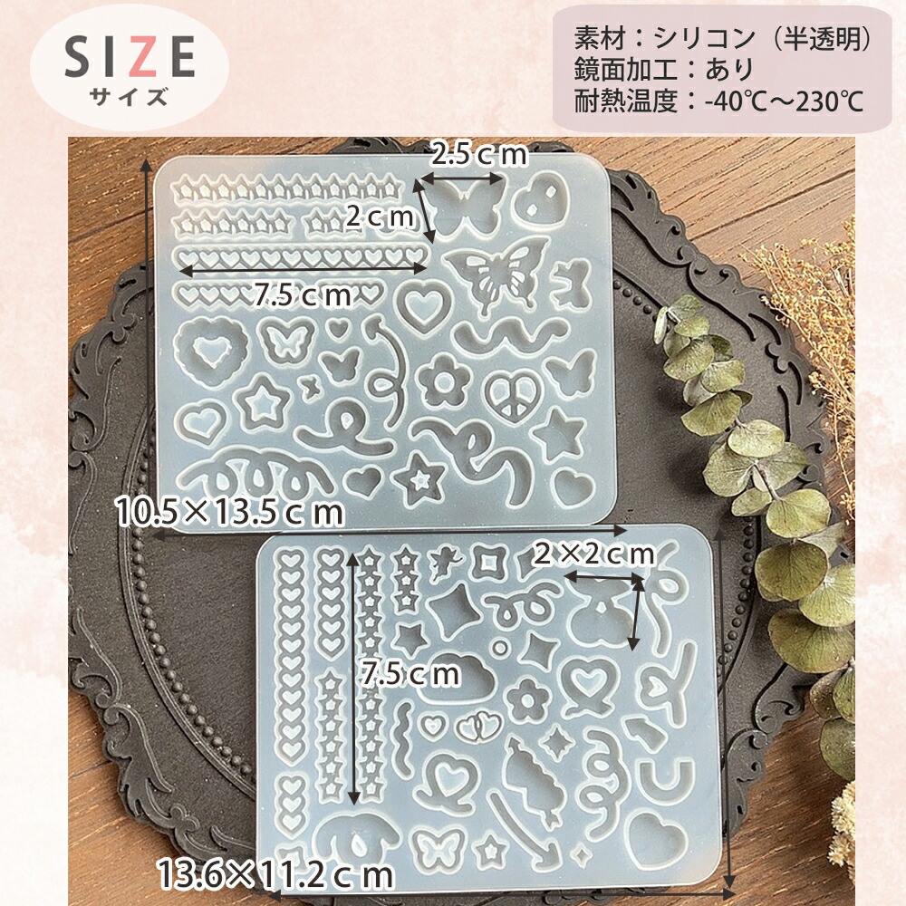 ちょうちょやハート、りぼん、星、さくらんぼ、雲、天使等の盛り盛りのデコパーツが作れるシリコンモールド2枚セットです。トレカデコや封入パーツとしても♪ 組み合わせでアレンジ自在♪ 推し活にもピッタリです。UVレジン、エポキシ樹脂、樹脂粘土などにご利用いただけます。