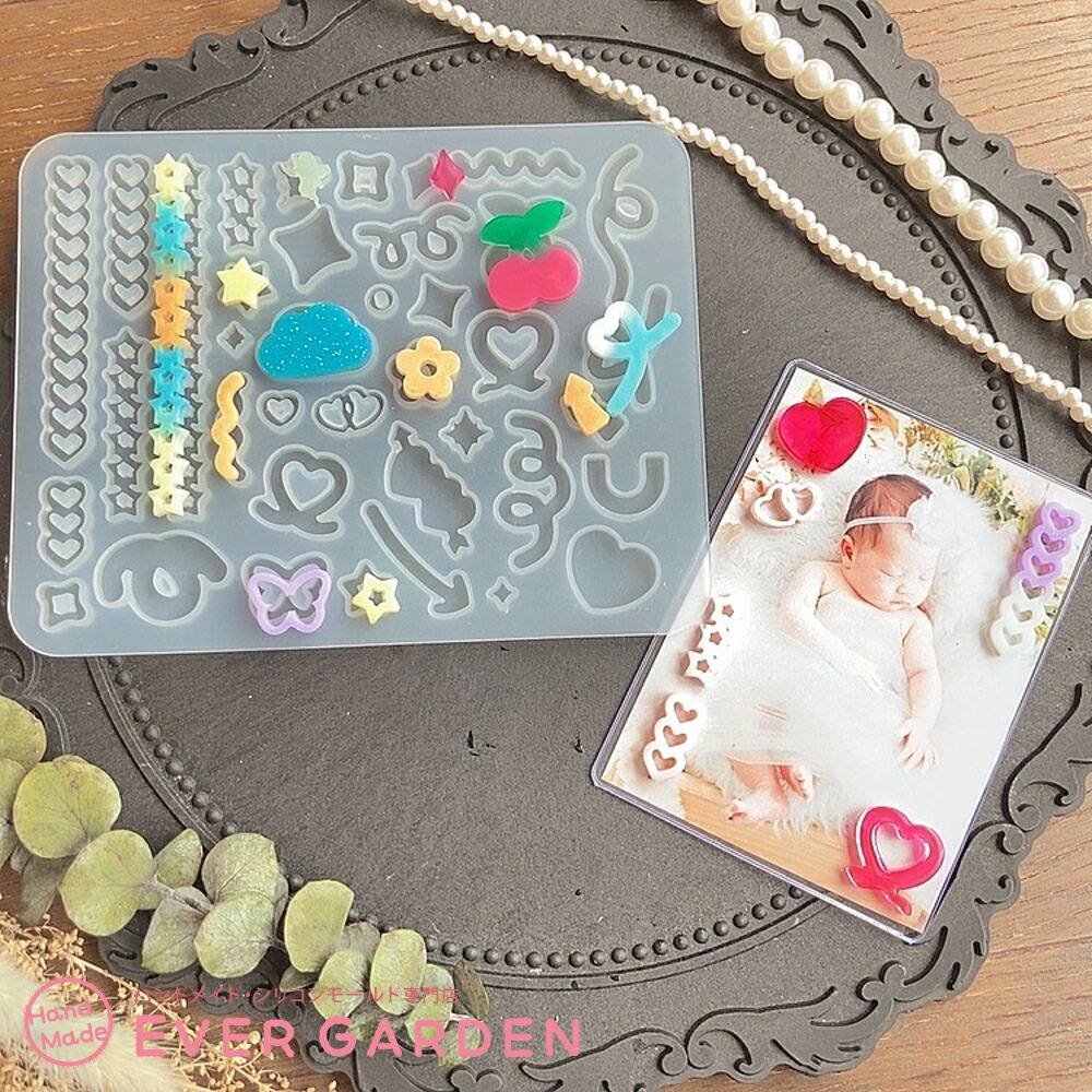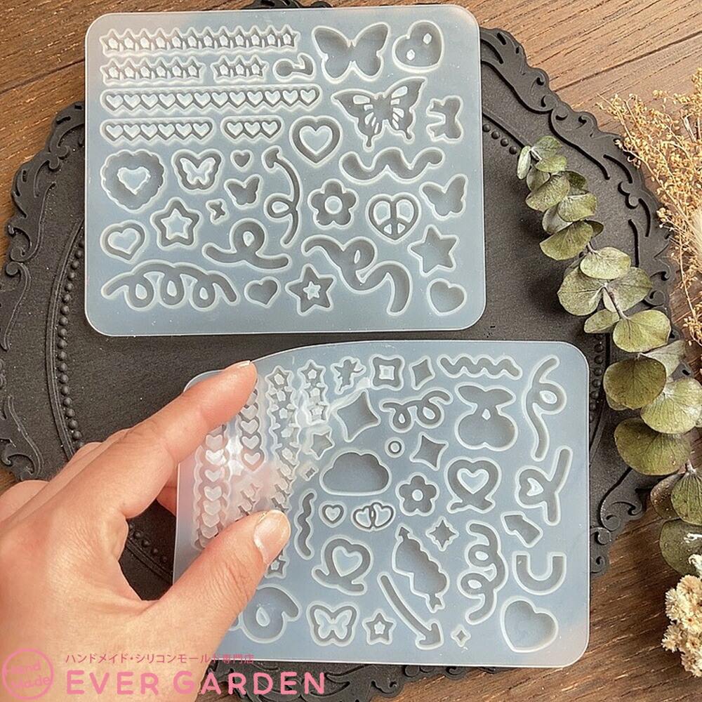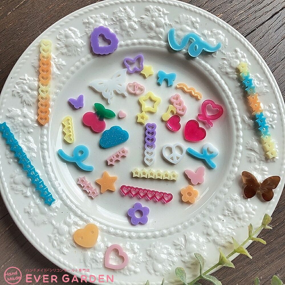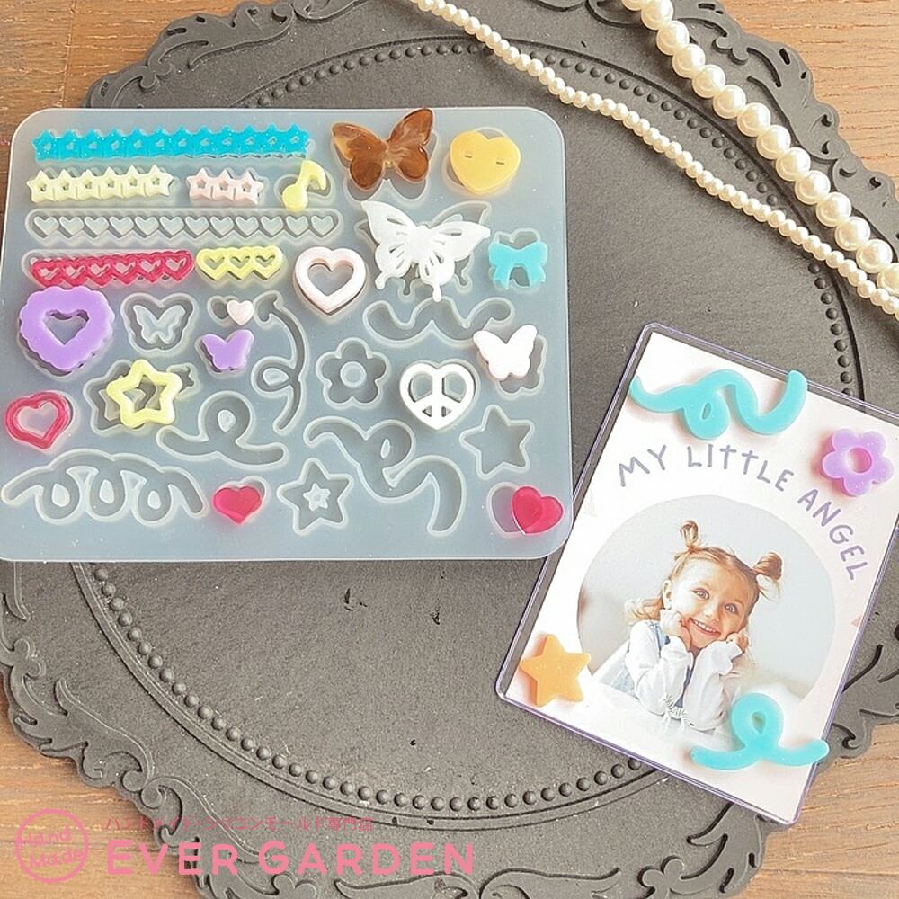 ちょうちょやハート、りぼん、星、さくらんぼ、雲、天使等の盛り盛りのデコパーツが作れるシリコンモールド2枚セットです。トレカデコや封入パーツとしても♪ 組み合わせでアレンジ自在♪ 推し活にもピッタリです。UVレジン、エポキシ樹脂、樹脂粘土などにご利用いただけます。