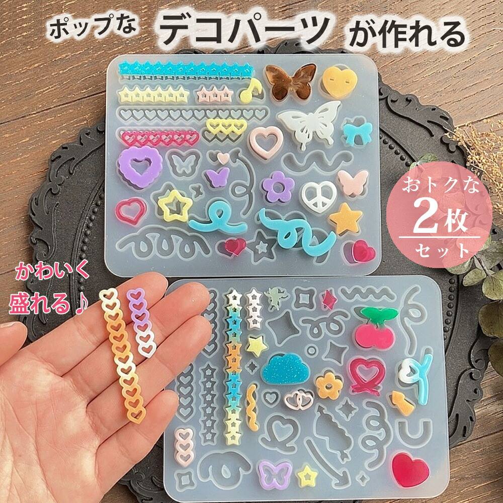 シリコンモールド デコパーツ2枚セットちょうちょ くるくる リボン ハート ほし さくらんぼ 雲 天使 トレカ デコ パーツ デコレジン リボ