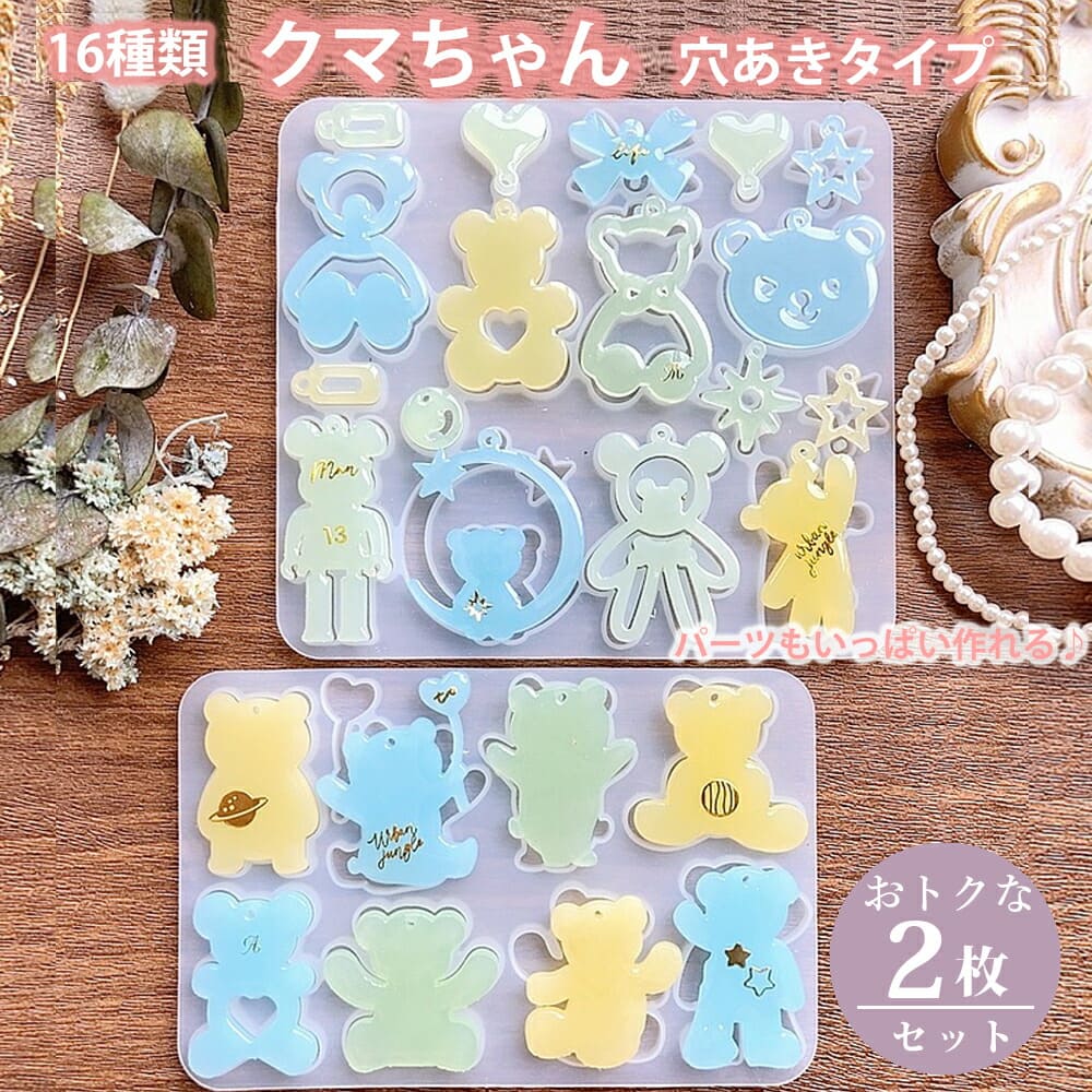 かわいいポーズのクマと星・月・リボン・ハート などが作れるシリコンモールド2枚セットです。穴あきタイプなのでとっても便利♪ キーホルダーやアクセサリーパーツにもピッタリです。かわいらしいポーズのシルエットクマちゃんと様々なパーツが作れるモールドのセットなので組み合わせ自在でアレンジ拡がる♪ 鏡面仕上げでツルツルの綺麗な作品が作れます。半透明でデザインも確認しやすい高品質なシリコンモールドです。丈夫で柔らかく取り出しやすく、初心者の方でも簡単に取り外せます、 UVレジン、エポキシ樹脂、樹脂粘土などにご利用いただけます。