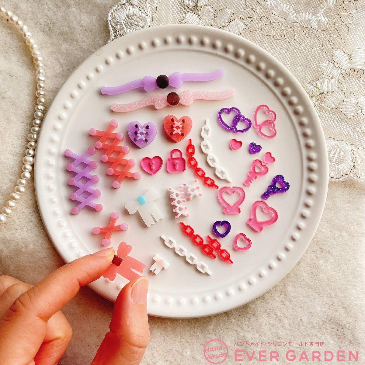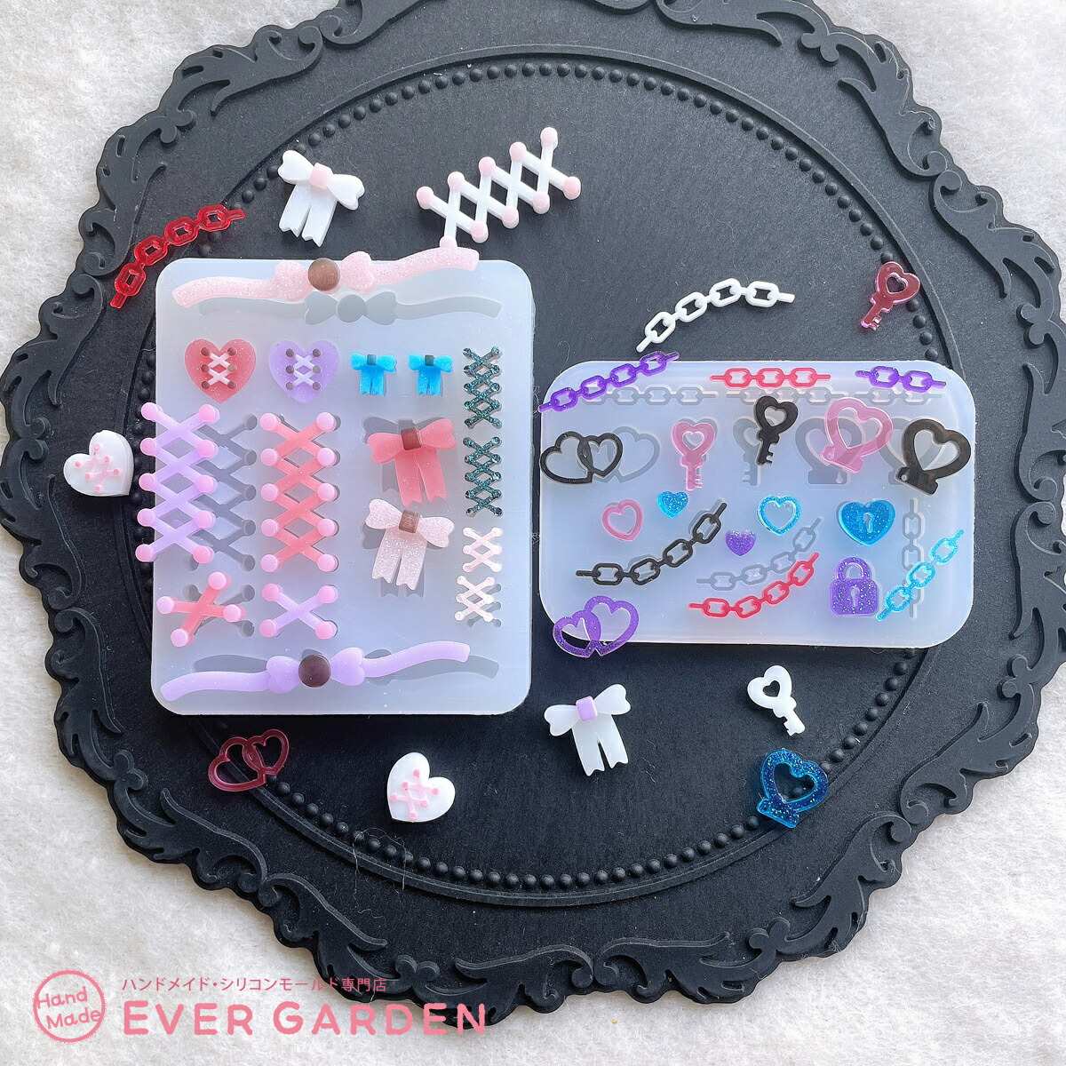 ハートやリボン、鍵などのデコパーツが作れるシリコンモールド2枚セットです。トレカデコや封入パーツとしても♪ 組み合わせでアレンジ自在♪ 推し活にもピッタリです。UVレジン、エポキシ樹脂、樹脂粘土などにご利用いただけます。