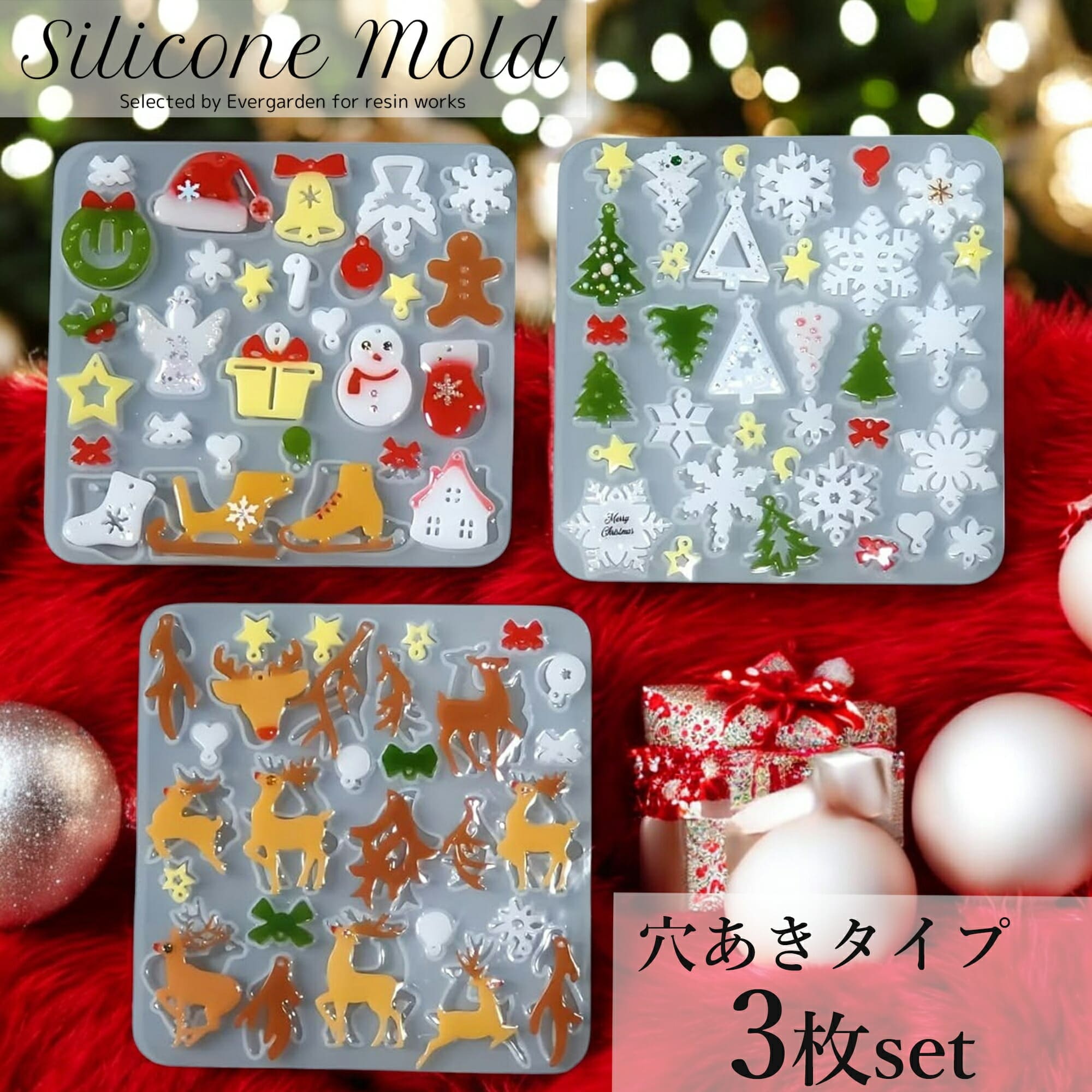 かわいいクリスマスパーツが作れるシリコンモールド穴あきタイプ3枚セットです。トナカイ ・ツリー・リース・サンタ帽・雪の結晶・プレゼント・クッキー・エンジェル・ベル・雪だるま・ソリ・手袋・スケート靴・リボン・星・ハート・丸・オーナメントモチーフなどが作れます。各パーツ穴あきで連結させるとユラユラ動く作品に♪組み合わせ次第でアレンジも広がるモールドです♪ 穴あきタイプで加工もしやすくとっても便利です。ピアスやイヤリング、キーホルダーにもピッタリのサイズです。 鏡面仕上げでツルツルの綺麗な作品が作れます。半透明でデザインも確認しやすい高品質なシリコンモールドです。丈夫で柔らかく取り出しやすく、初心者の方でも簡単に取り外せます、 UVレジン、エポキシ樹脂、樹脂粘土などにご利用いただけます。