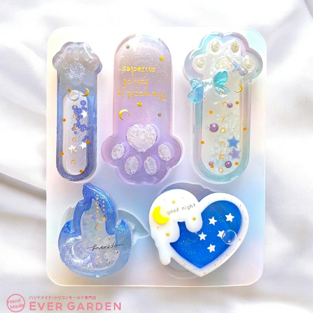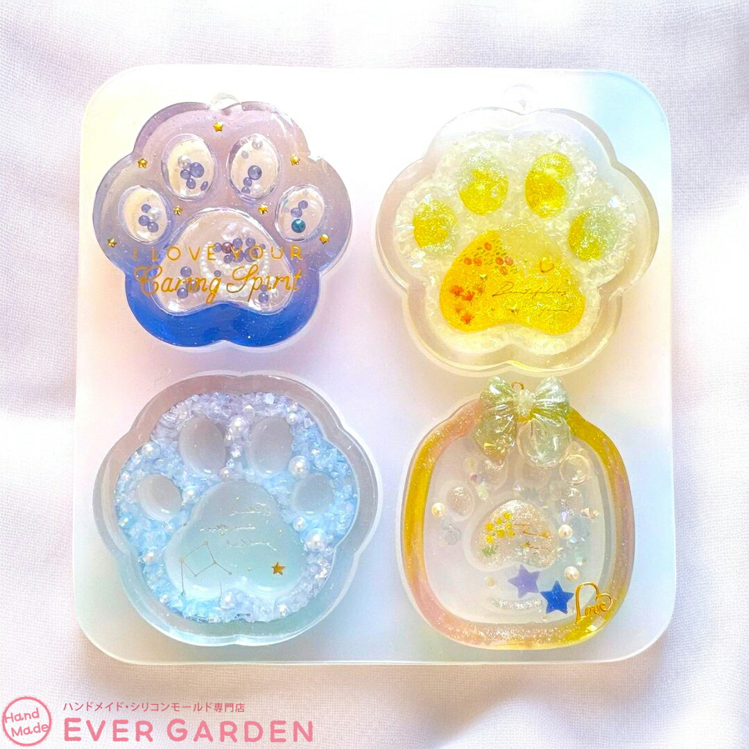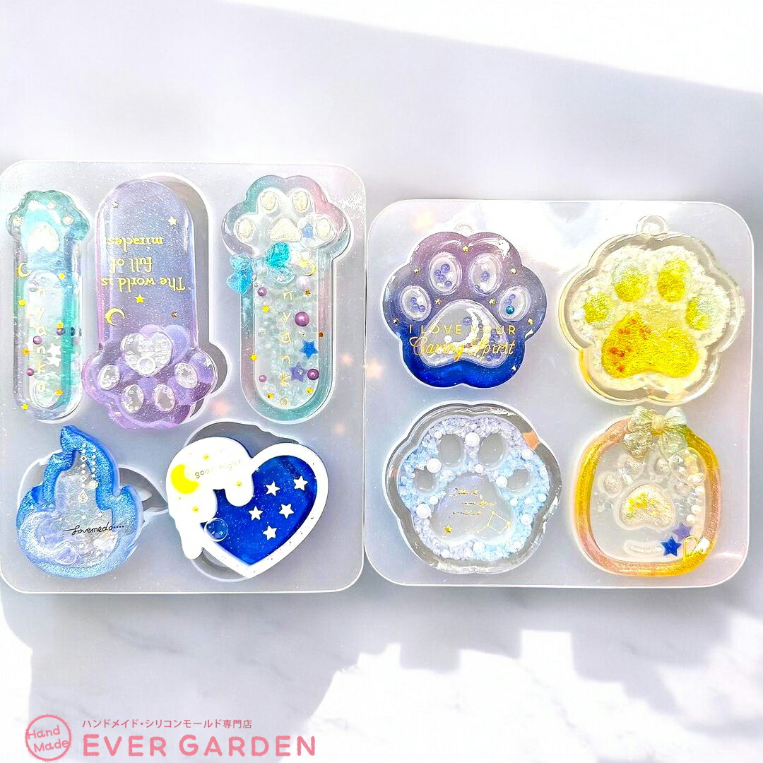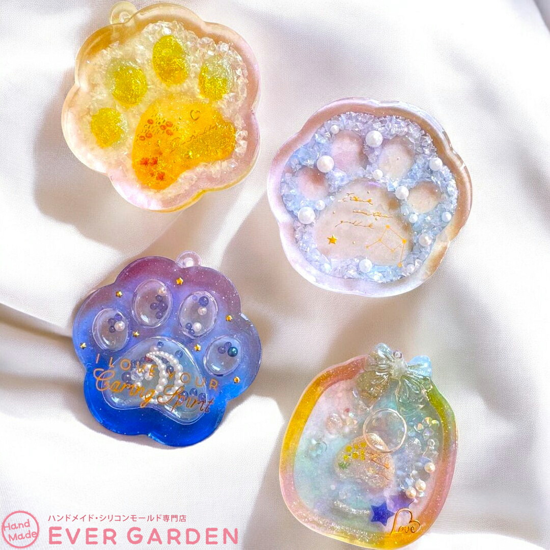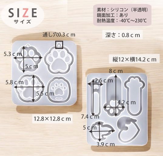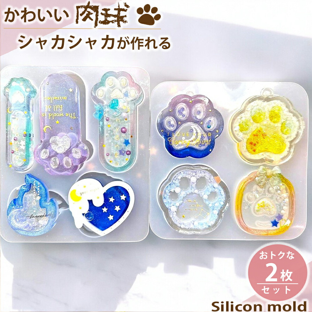 かわいい肉球やハート・炎のシャカシャカが作れるシリコンモールドの2枚セットです。 かわいい立体的な肉球やおててモチーフの肉球、通し穴付きの肉球・ハート・炎などバリエーション豊かなセットです♪キーホルダーやチャームに最適なサイズです。プレゼントにも♪ 高品質の半透明のシリコンモールドです。丈夫で柔らかく取り出しやすく、初心者の方でも簡単に取り外せます。 UVレジン、エポキシ樹脂、樹脂粘土などにご利用いただけます。
