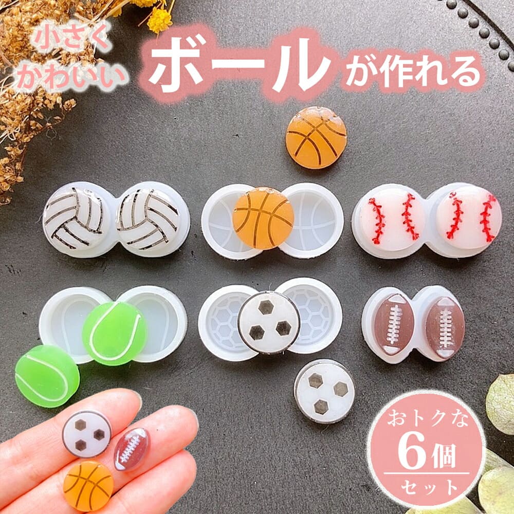 様々なボールが作れるシリコンモールド6個セットです。サッカーボール・バスケットボール・野球ボール・ラグビーボール・バレーボール・テニスボールの6種類のボールが作れます。小さいタイプなのでキーホルダーやアクセサリーパーツ等、色んなパーツとしてお使いいただけます。プレゼントにもピッタリです♪