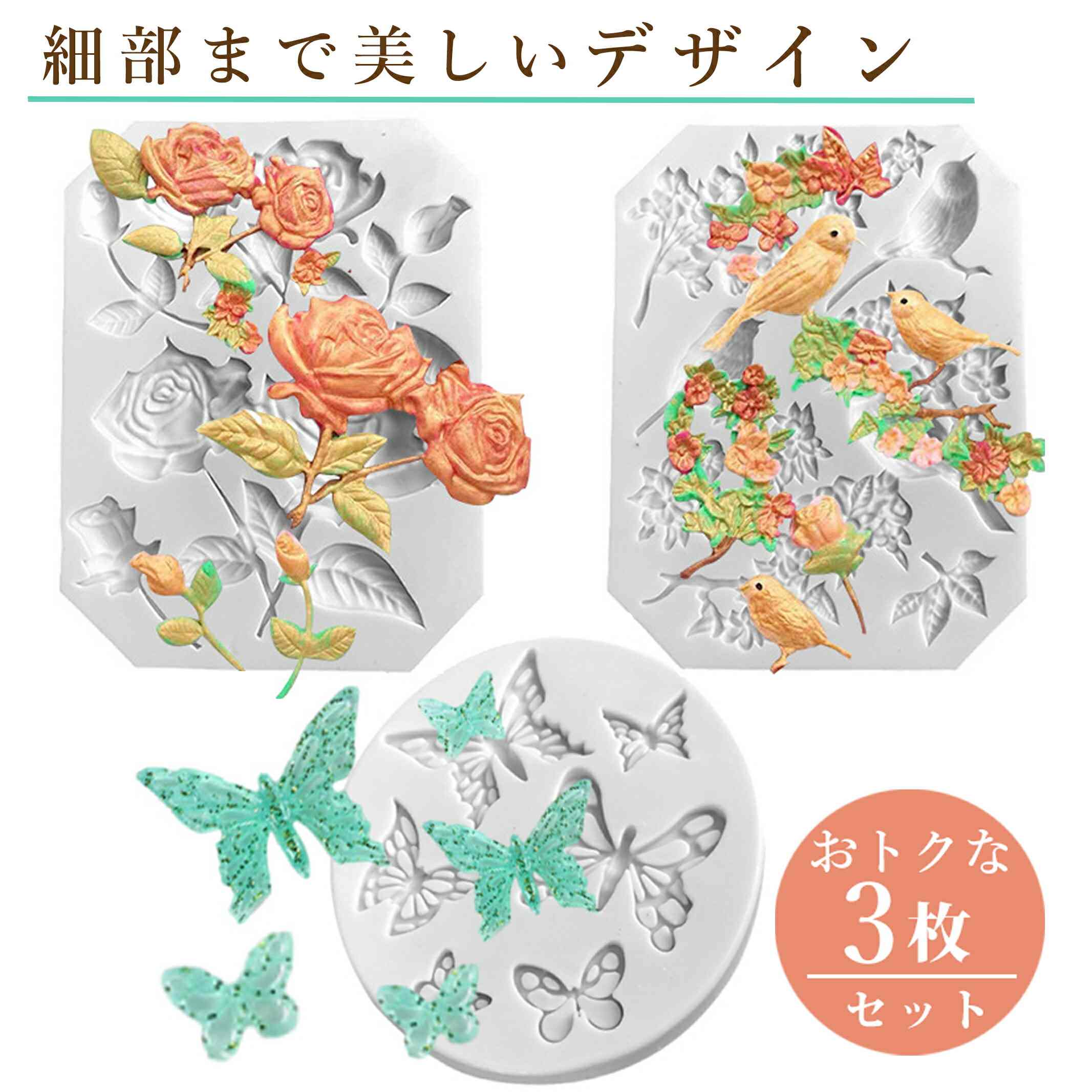 様々な形のバラや花 鳥 蝶が作れるシリコンモールド3枚セットです。細部まで細やかなデザインなので繊細な作品が作れます。ハンドメイド作品としてお使いいただけます。キャンドルや粘土、石膏やレジン(2液)の制作にも最適です。不透明のモールドでUVライトの照射が届かず未硬化になる可能性があるため、2液性レジンの使用をお勧めいたします。