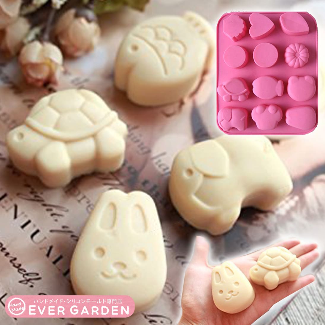 【Ever garden】うさぎ シリコンモールド うさぎ カメ ゾウ クマ バラ / 手作り 石鹸 / キャンドル / 粘土 / バスボム / レジン / シリコン モールド / 型 抜き型 / ハンドメイド 制作 新入荷 【オススメ】