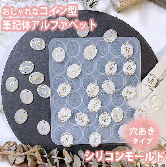 アルファベット コイン 筆記体 シリコンモールド 穴あき レジン バック チャーム キーホルダー アクセサリー パーツ uvレジン シリコン モールド