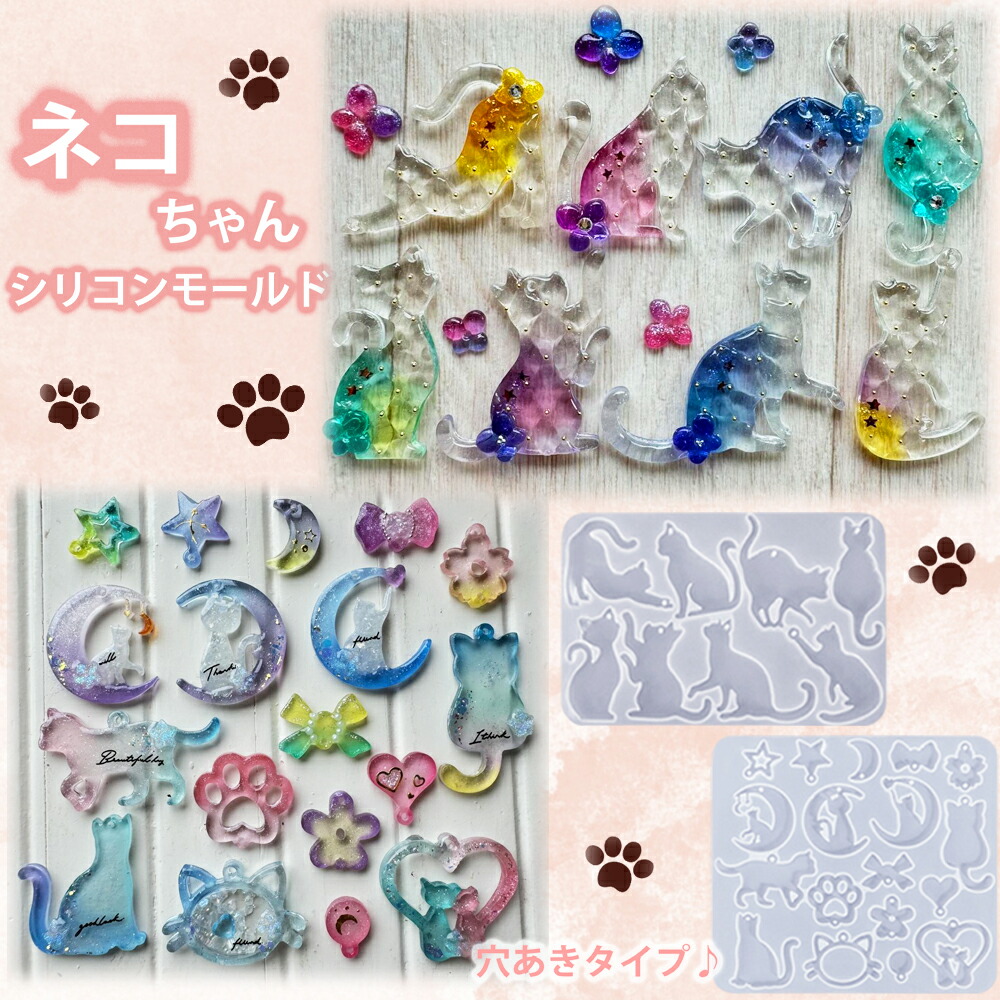 かわいいポーズのネコと肉球・星・月・リボン・ハート・花 などが作れるシリコンモールド2枚セットです。穴あきタイプなのでとっても便利♪ キーホルダーやアクセサリーパーツにもピッタリです。かわいらしいポーズのシルエットネコちゃんと様々なパーツが作れるモールドのセットなので組み合わせ自在でアレンジ拡がる♪ 鏡面仕上げでツルツルの綺麗な作品が作れます。半透明でデザインも確認しやすい高品質なシリコンモールドです。丈夫で柔らかく取り出しやすく、初心者の方でも簡単に取り外せます、 UVレジン、エポキシ樹脂、樹脂粘土などにご利用いただけます。