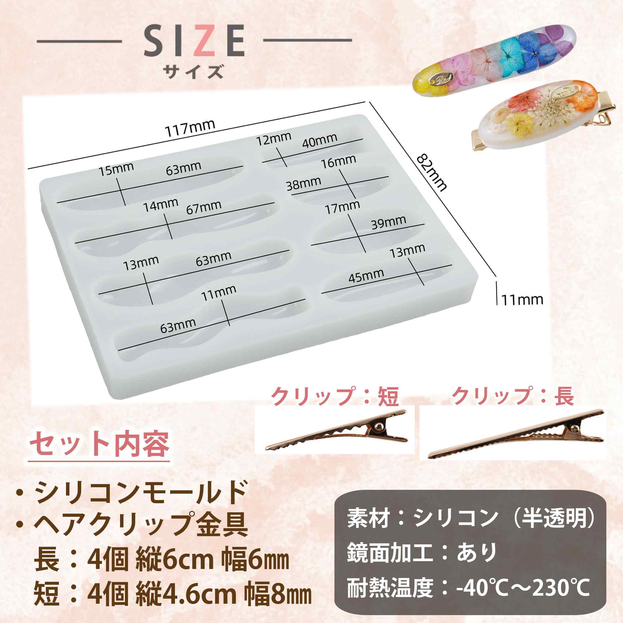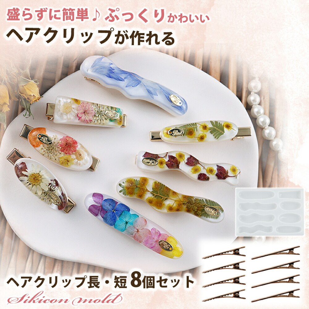 シリコンモールド ヘアピンクリップ8個付きヘアクリップ ヘアアクセ アクセサリー パーツ イヤリング ピアス キーホルダー シリコン モールド