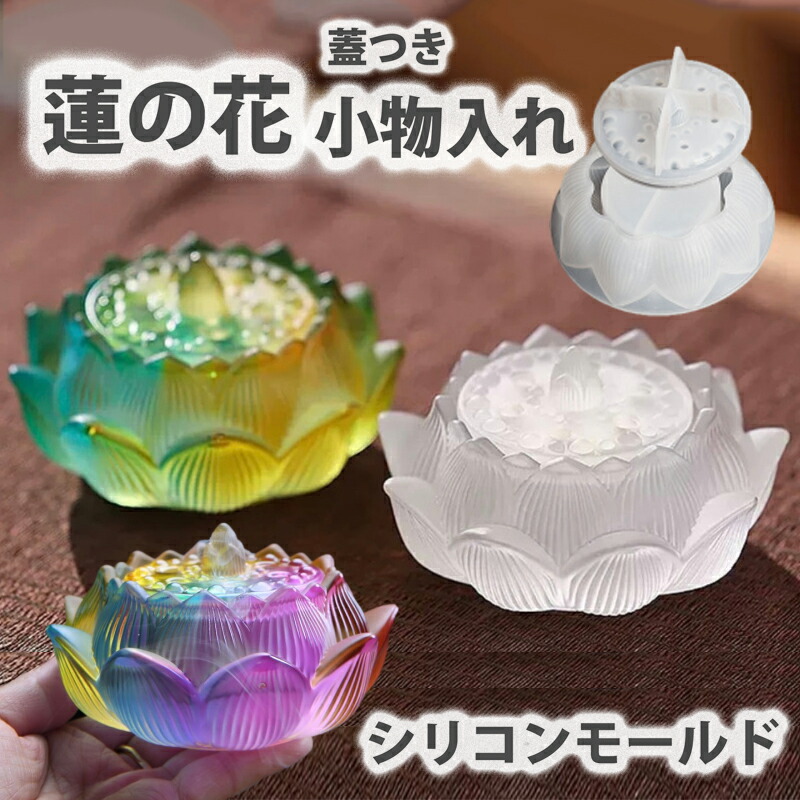 かわいい蓮の花型の小物入れが作れるシリコンモールドです。蓮の花の上の部分が蓋になっている蓋つきの小物入れです。アクセサリー入れとしてもオシャレに仕上がります。2液性レジン、エポキシ樹脂、樹脂粘土などにご利用いただけます。