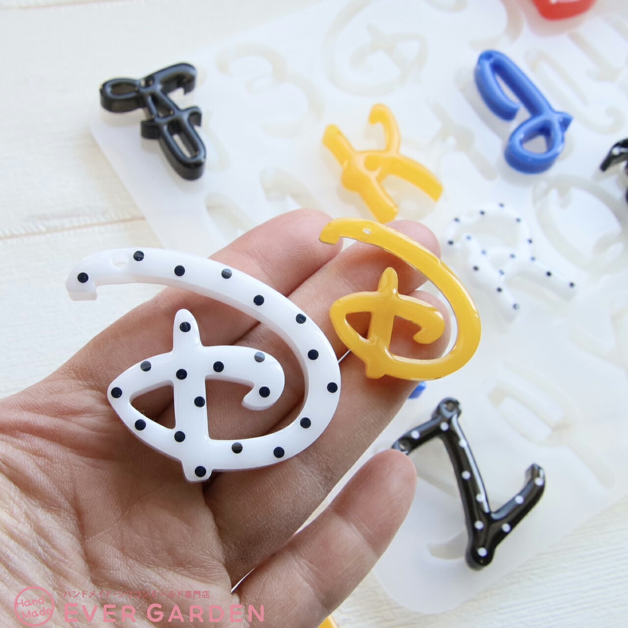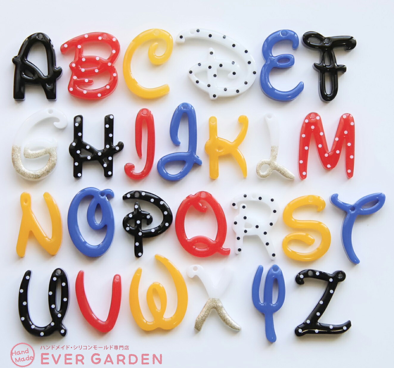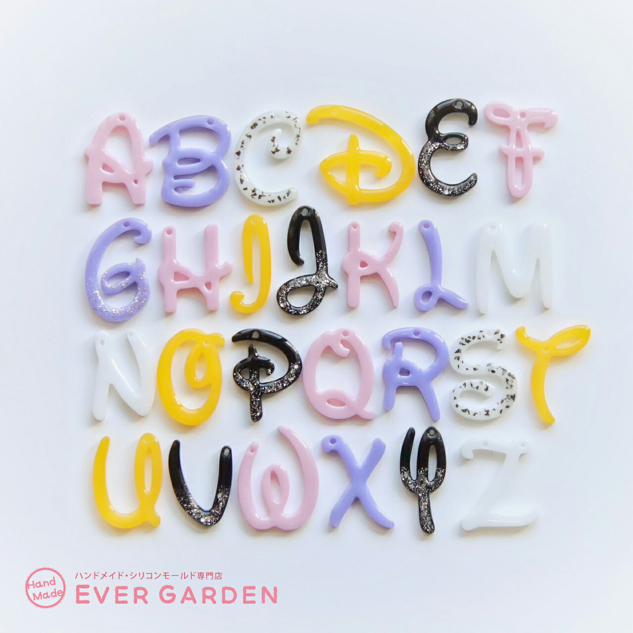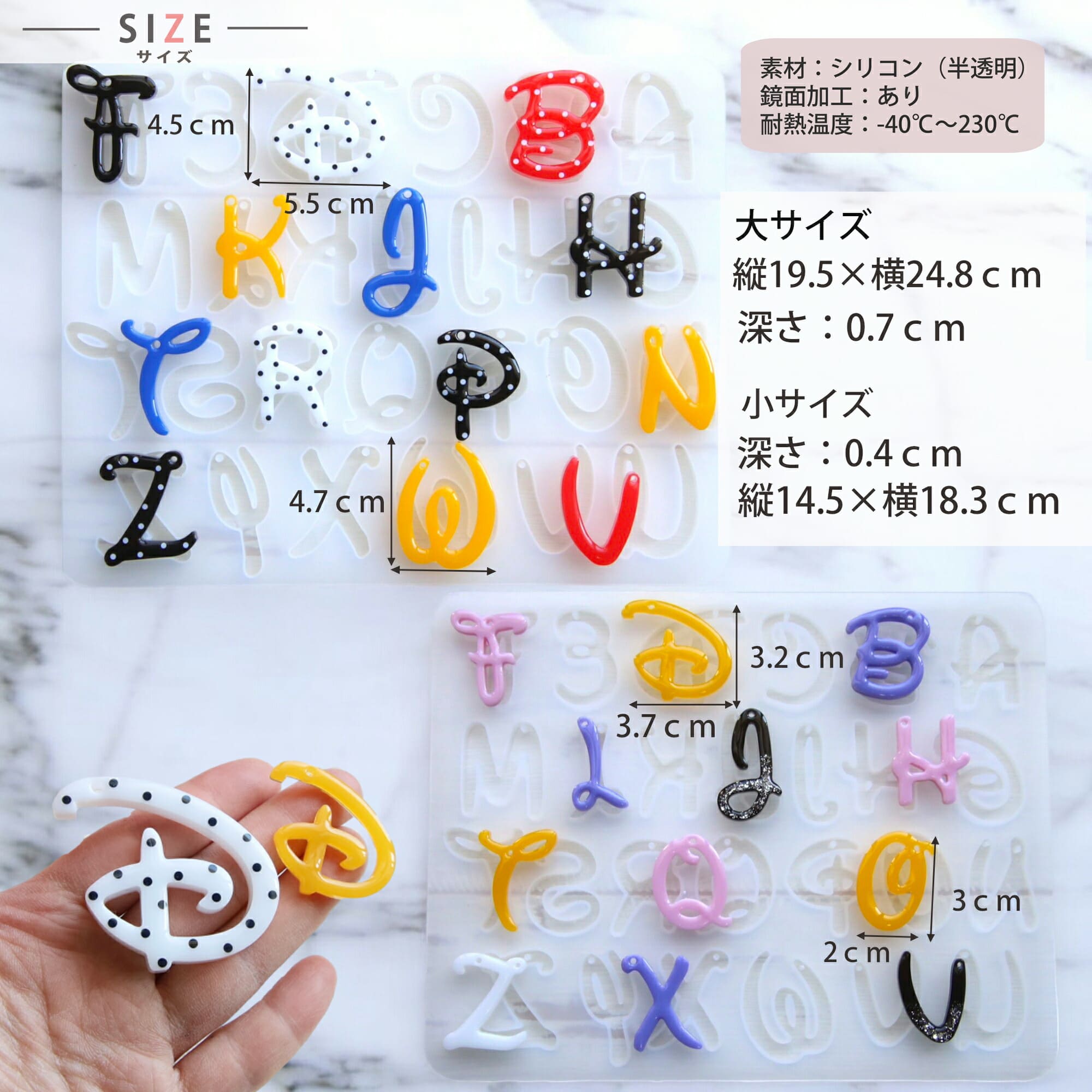 夢の国デザインのアルファベットの大文字が2サイズ作れるシリコンモールドです。穴あきタイプなのでキーホルダーやチャーム作りに最適です。プレゼントにも♪鏡面仕上げでツルツルの綺麗な作品が作れます。半透明でデザインも確認しやすい高品質なシリコンモールドです。丈夫で柔らかく取り出しやすく、初心者の方でも簡単に取り外せます、 UVレジン、エポキシ樹脂、樹脂粘土などにご利用いただけます。