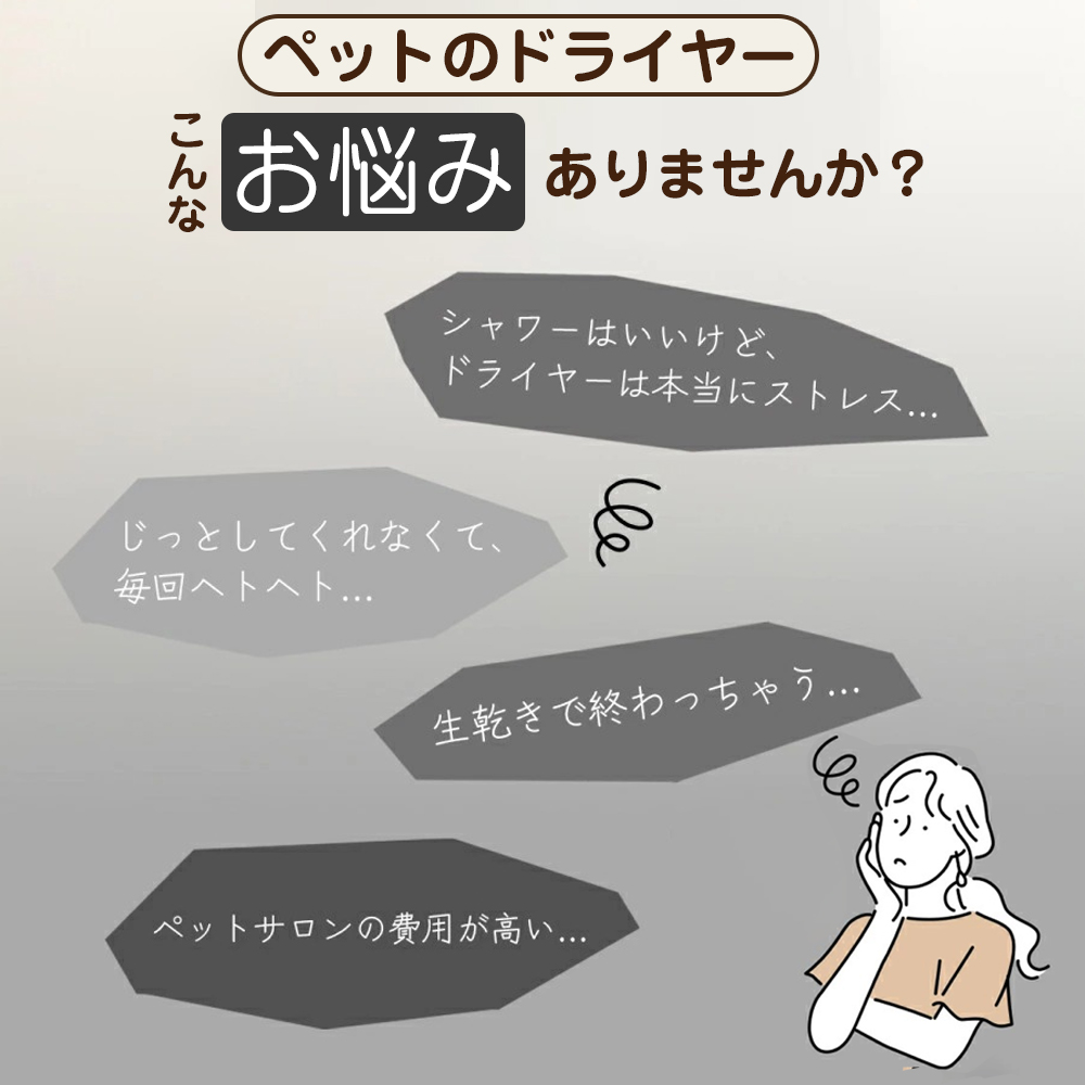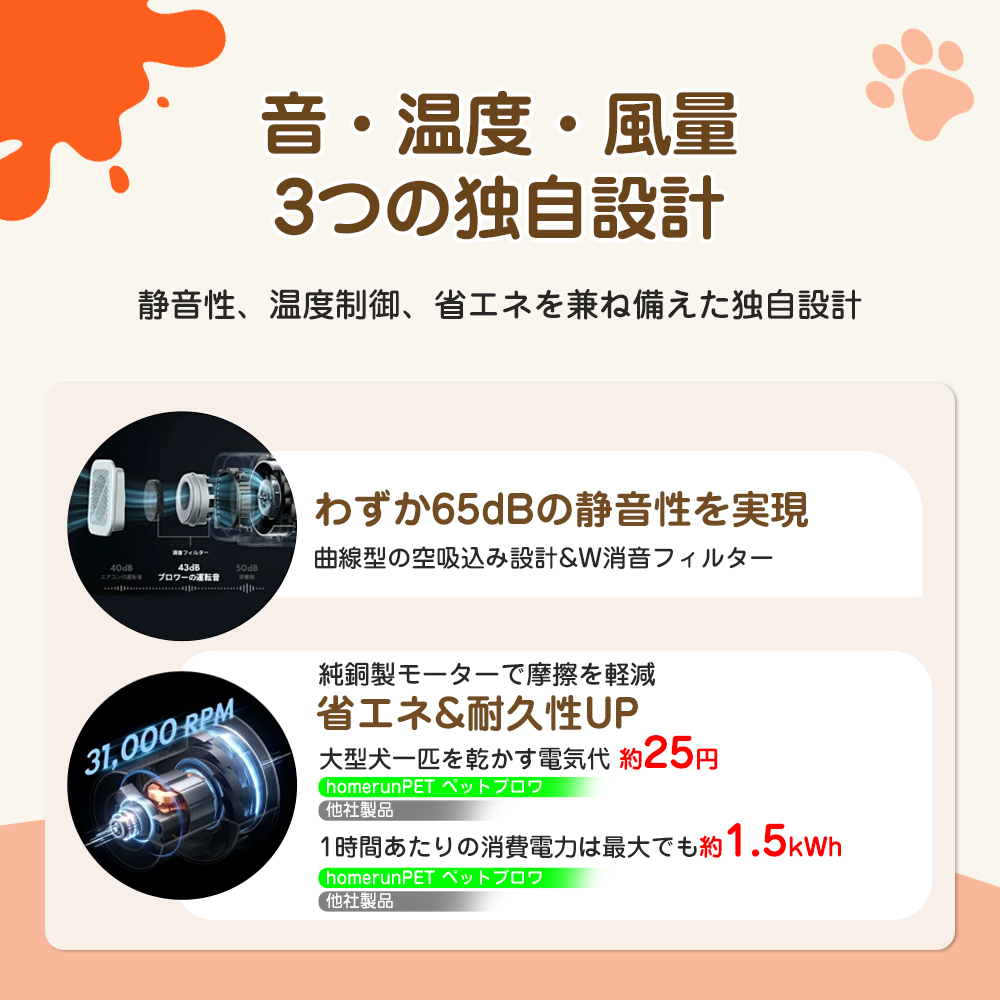 【低騒音・省エネ設計で安心かつ経済的】 65dB 以下の静粛性を実現した構造で、ペットを驚かせることなく穏やかにケアができます。純銅製モーターにより摩擦を軽減し、省エネ性と耐久性を向上させており、大型犬を乾かす際の電気代も約 25 円程度に抑えられ、長期的に経済的です。