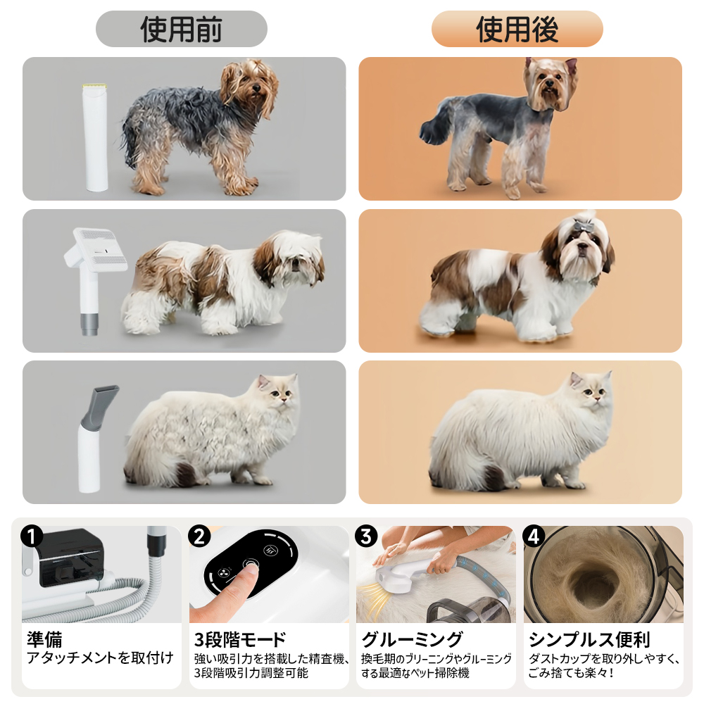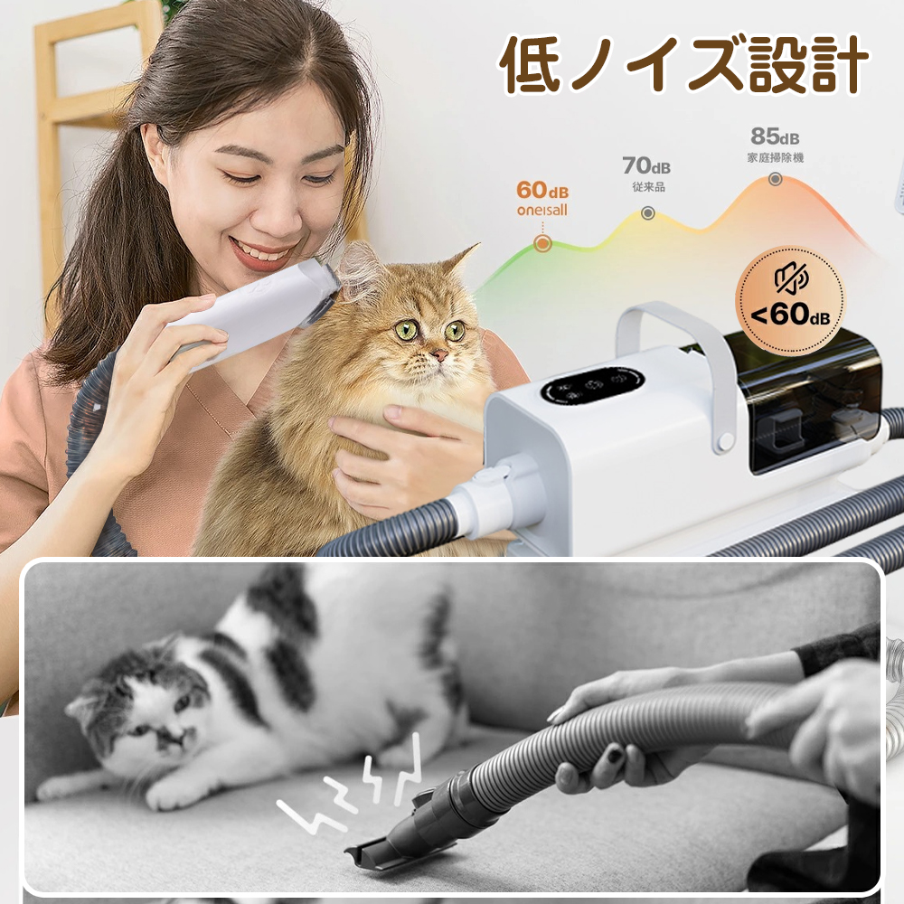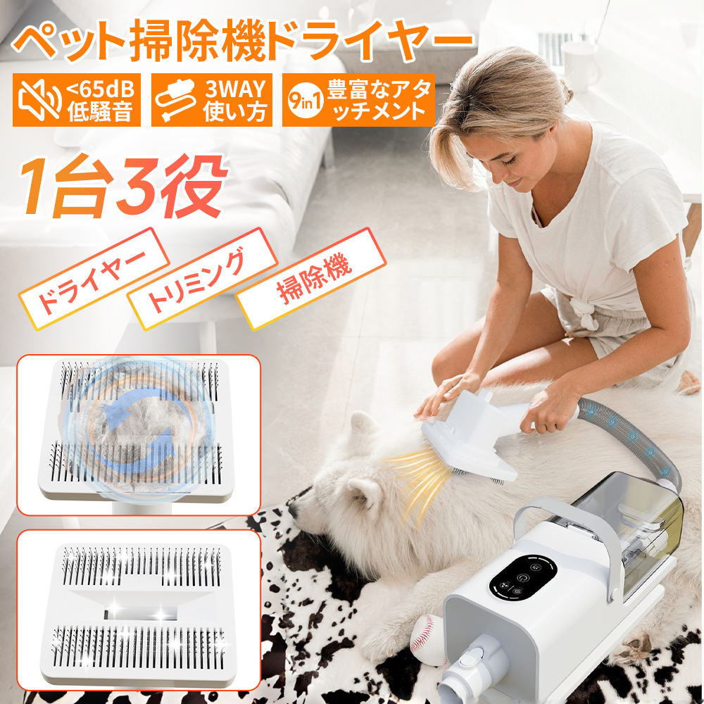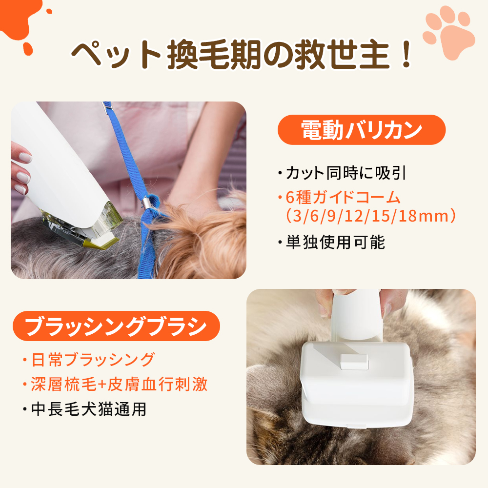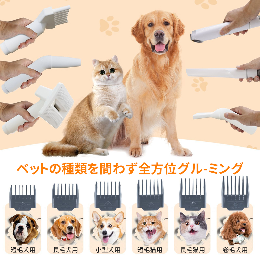 【1 台多機能でペットケアを一括解決】 ペット換毛期の悩みに応える、電動バリカン(カット同時吸毛 + 6 種ガイドコーム)、ブラッシングブラシ(深層梳毛 + 皮膚血行刺激)に加え、ドライヤー・トリミング・掃除機の 3 役を兼ね備えた 1 台で、ペットの美容・日常ケア作業を効率的にまとめて行えます。