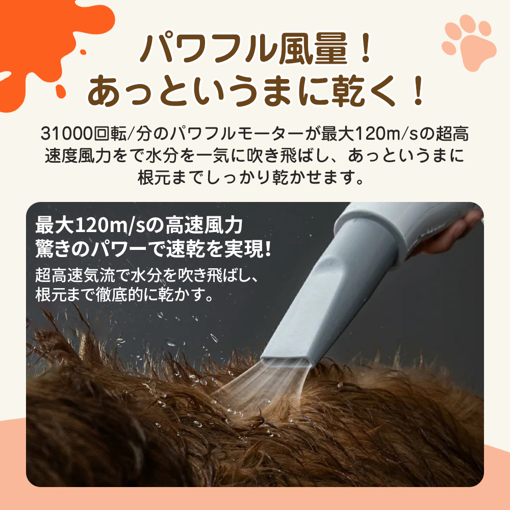 【強力風量で迅速かつ徹底的な乾燥】 31000 回転 / 分のパワフルモーターが最大 120m/s の高速風力を発揮し、ペットの毛根元まで水分を一気に吹き飛ばして迅速に乾かせます。小型犬・猫から大型犬まで幅広く対応し、各サイズに合わせた適切な乾燥時間で快適なケアが可能です。