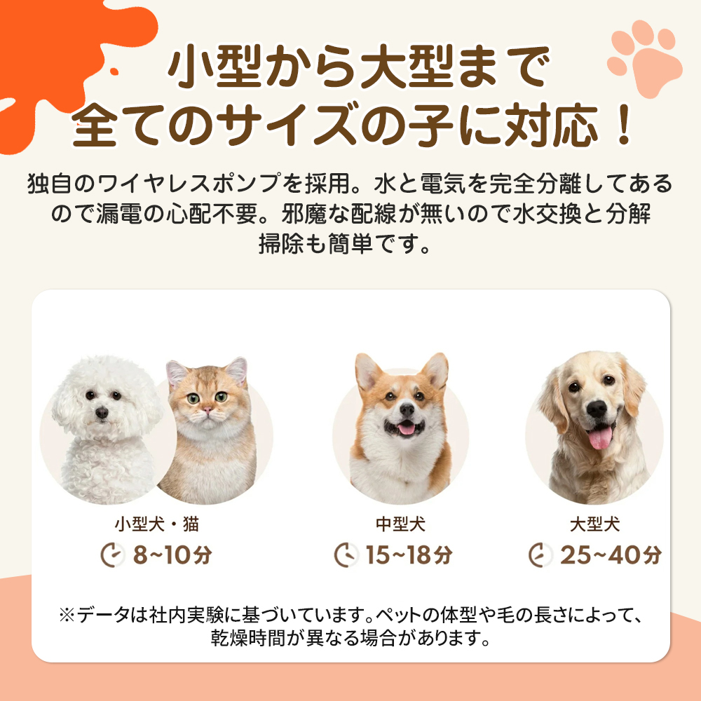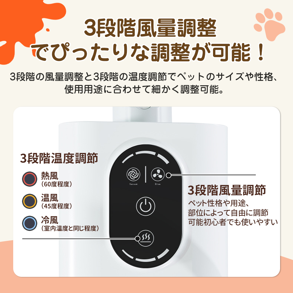 3 段階の風量調整と 3 段階の温度調節(熱風 / 温風 / 冷風)を備え、ペットのサイズや性格、使用シーンに合わせた最適な設定が可能です。また、水と電気を完全分離した構造で漏電の心配がなく、初心者の方でも安心してご使用いただけます。