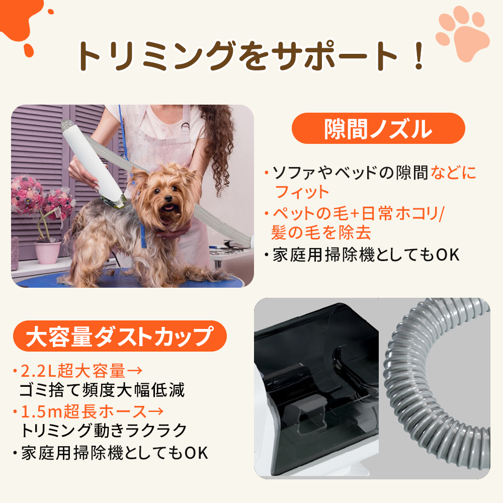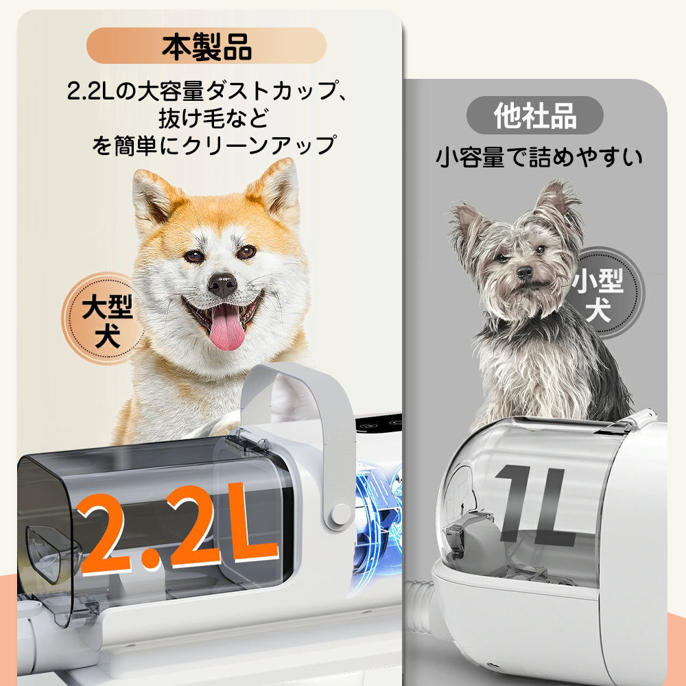 【大容量ダストカップと大幅なコスト削減】 2.2L の大容量ダストカップを搭載し、ペットの抜け毛をまとめてクリーンアップすることが簡単です。ペット美容室に比べ、作業時間を大幅に短縮し、1 回あたりの費用も約 100 円程度に抑えられ、長期的なコスト削減にも貢献します。