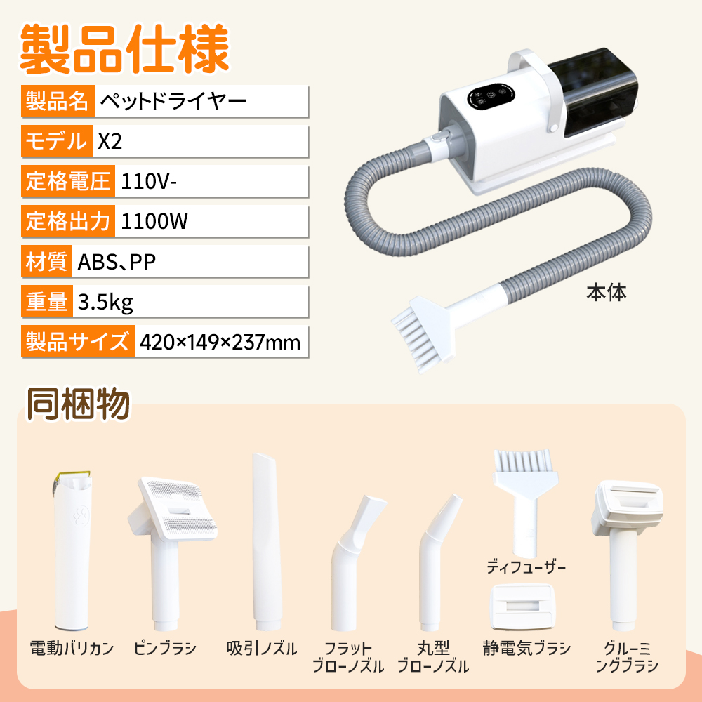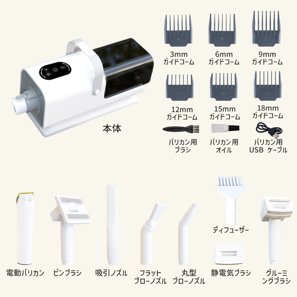 同〓物:本体、電動バリカン、グルーミングブラシ、ディフューザー、ピンブラシ、静電気ブラシ、吸引ノズル、フラットブローノズル、