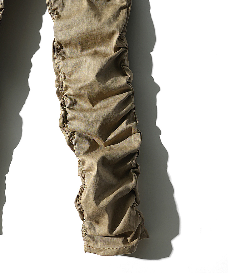 [Mサイズ]を着用しましたウエストや太もも周りは少しゆとりがありますが、裾の長さはちょうど良かったです。シャーリングのデザインが特徴的なアイテムです!