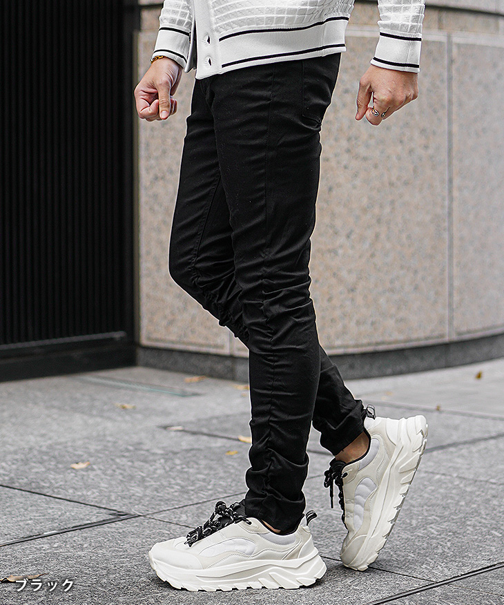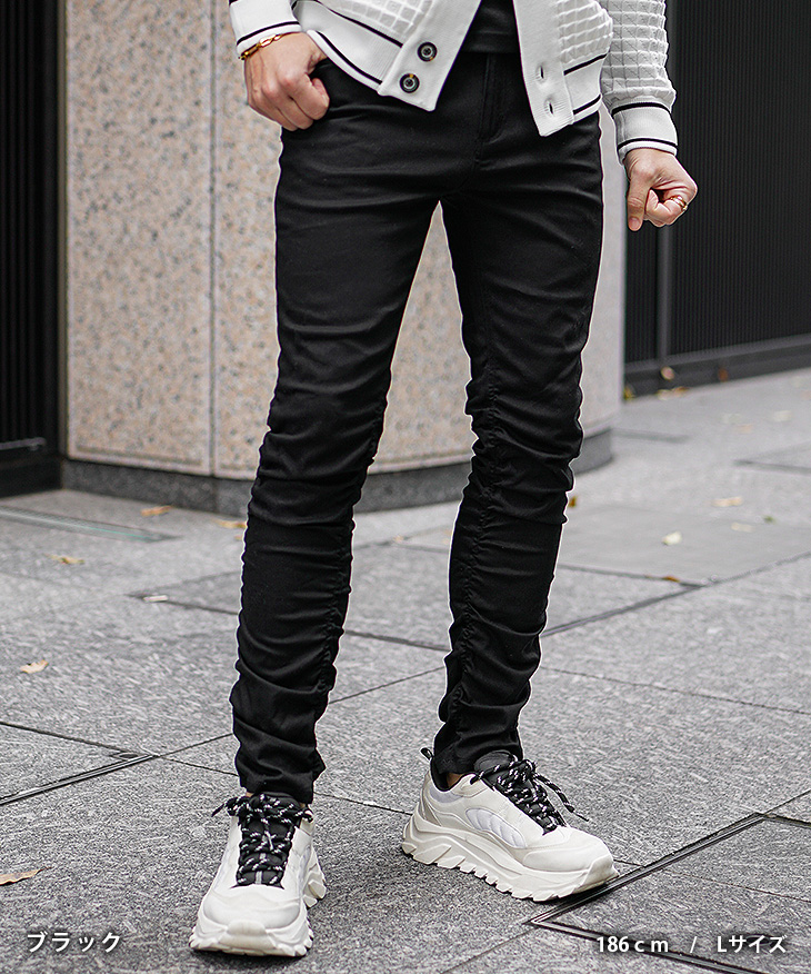 [Lサイズ]を着用しましたウエストが少し余裕がありますが、それ以外はピタッとしていて脚のラインがきれいに見えます。スッキリとしたシルエットを演出できるので、男らしさを求める方にはピッタリなアイテムです。