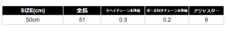 全長(cm)51キヘイチェーン本体幅(cm)0.3ボール付きチェーン本体幅(cm)0.2アジャスター(cm)6