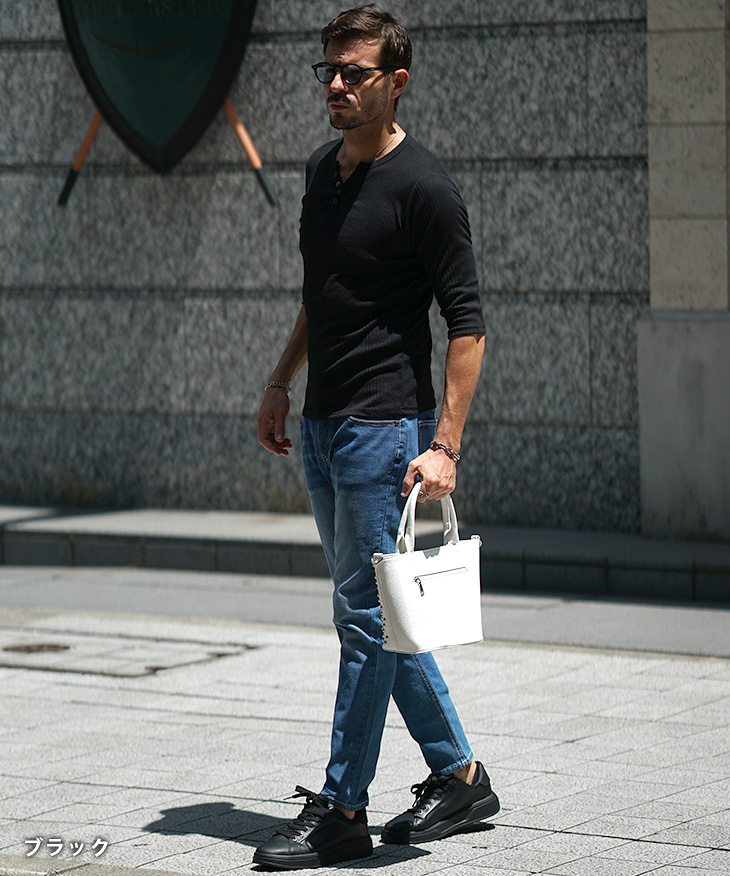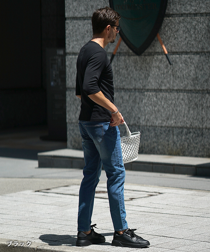 一枚で着てもサマになり、ジャケットのインナーとしても映える、汎用性の高いデザインです。