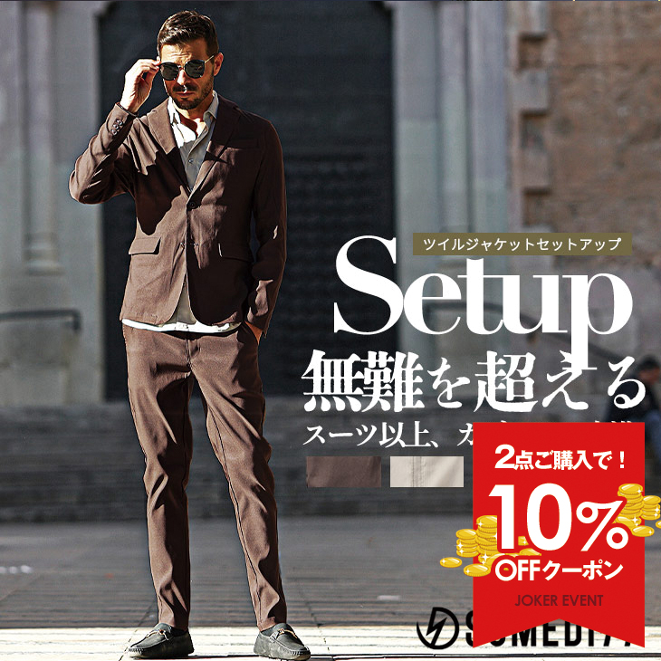 [Lサイズ]を着用しました程よくジャストなサイズ感でした。ジャケットの着丈はお尻が7分ほど隠れ、袖丈は手の甲半分が隠れる長さです。フロントボタンを留めても窮屈感はありません。パンツの丈はくるぶしが隠れるあたりで、ウエストは拳一つ半の余裕があります。脚のラインには沿いますが、全体的にひとつまみできる余裕があります。Lサイズでも問題ないですが、細身な方はMサイズの方がフィット感があってカッコよく決まります。