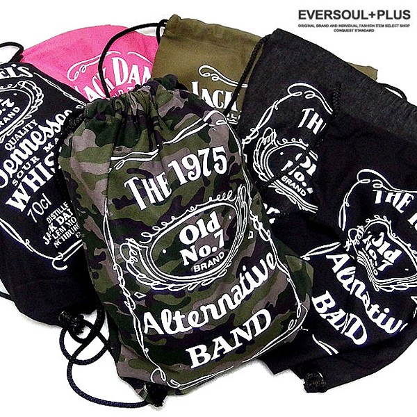 シンプルで使い勝手の良いボトルラベルプリントナップサック!通勤、通学やジムウェア、シューズ入れ等に使えます!2種類のプリントデザイン、全6色展開で迷っちゃいますね!