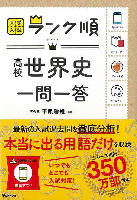 最新入試問題データを徹底分析した、世界史一問一答の決定版。重要頻度をランク順で明示し、「出る」項目を効率よく覚えられる。最新入試問題データを徹底分析した、世界史一問一答の決定版。重要頻度をランク順で明示し、「出る」項目を効率よく覚えられる。また、本書の内容に対応した「アプリ」が無料で利用できるので、覚えた用語をいつでもどこでも手軽に復習することができる。