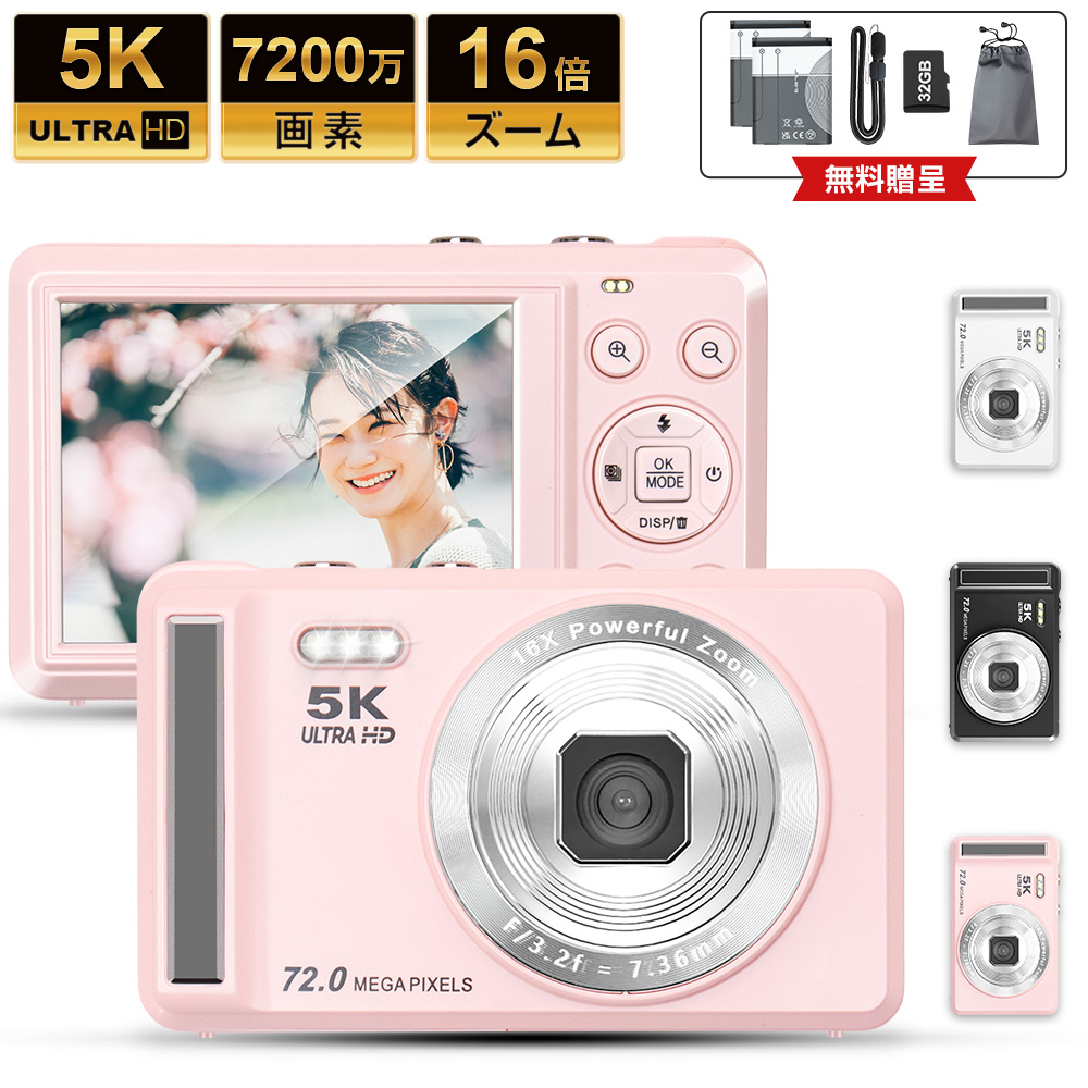 デジタルカメラ 5K録画 7200万画素 子供用トイカメラ 2.8インチ大画面 キッズカメラ 16倍ズーム 子どもカメラ タイマー撮影 2個バッテリー 32GB SDカード付き