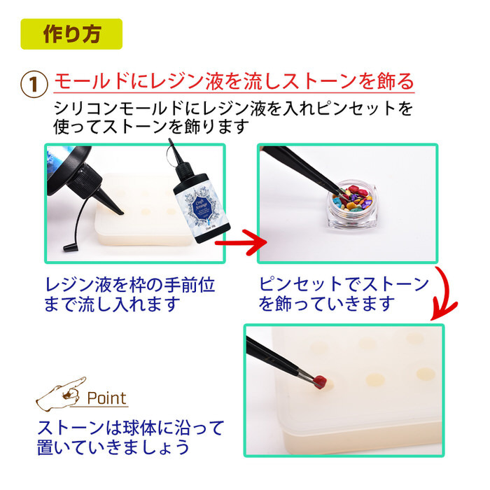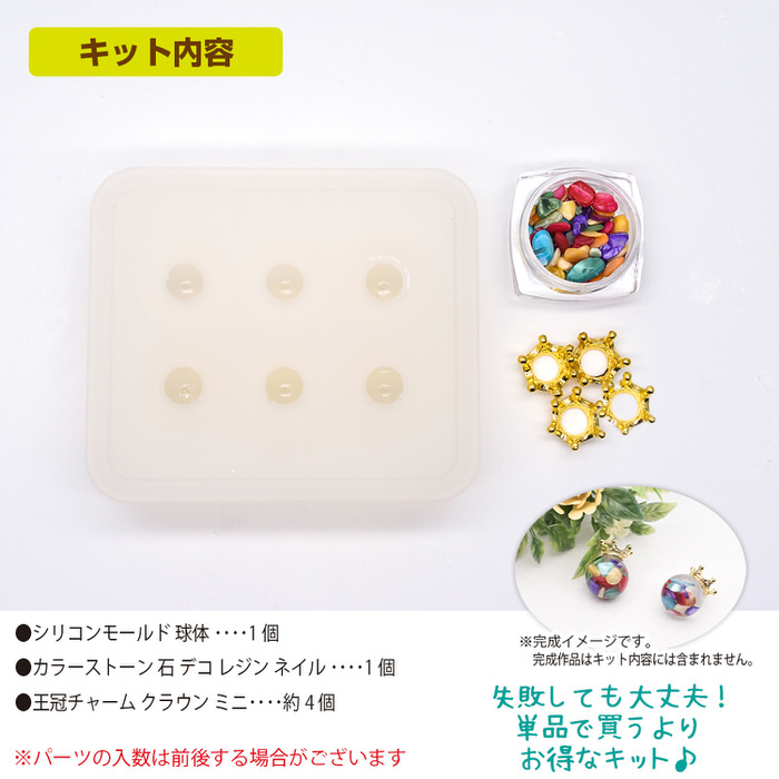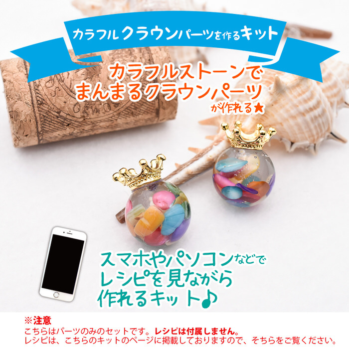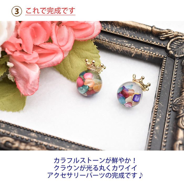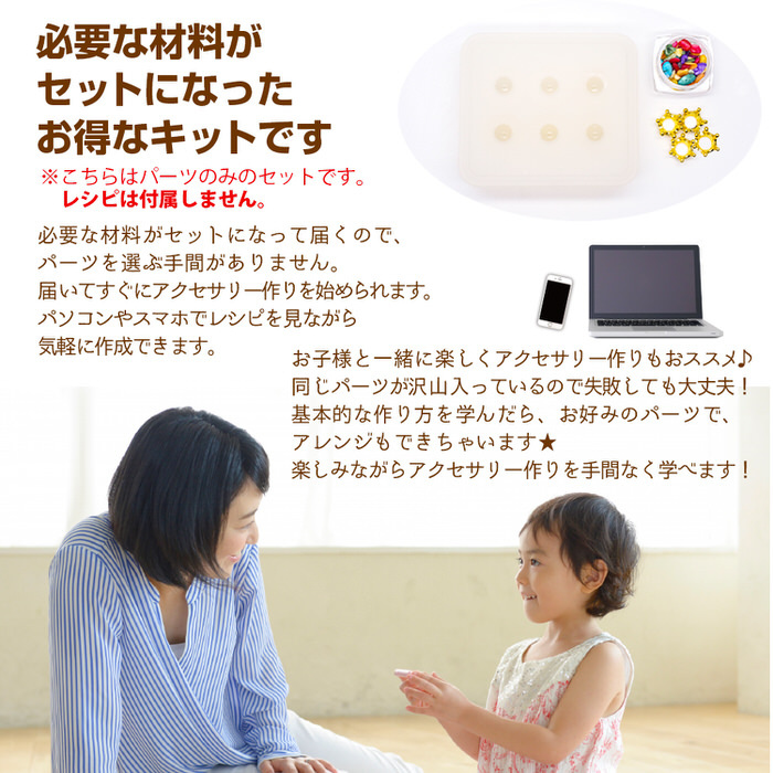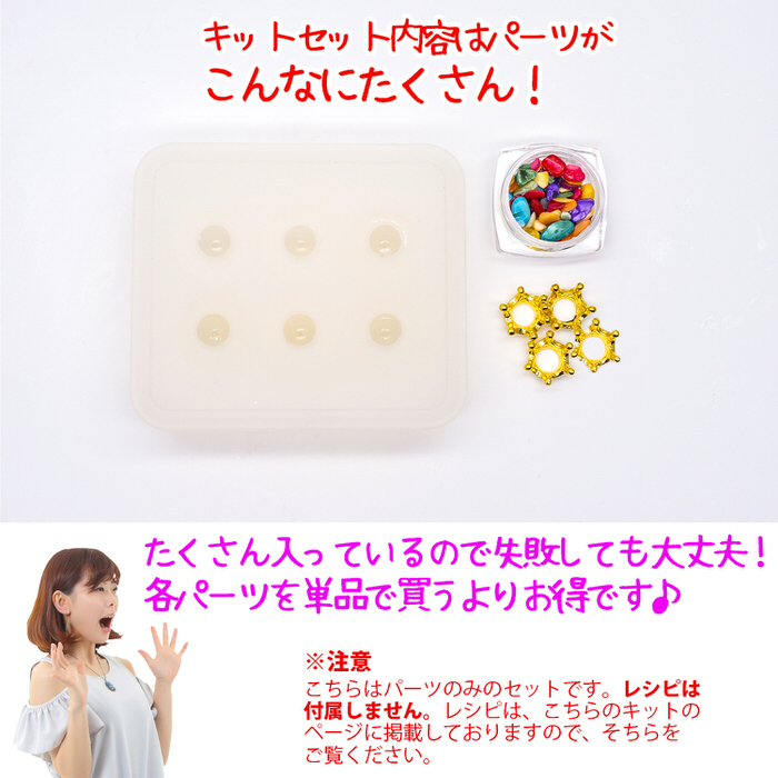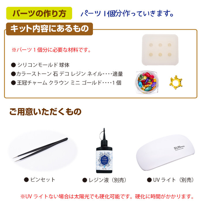 必要な材料がセットになっていますので、パーツを選ぶ手間がありませんので、すぐに作成を始められます。(レジン液は別売りとなりますので、別途ご用意ください。)