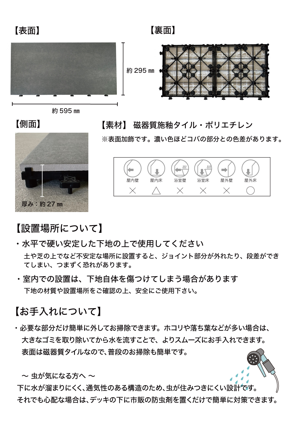 縦:約595mm 横:約295mm 高さ:約27mm 重量:約3.65kg 販売単位:1ケース(6枚入) 平米必要枚数:5.6枚/m2 設置方法:屋内、屋外床(ベランダ等の平らな場所) |