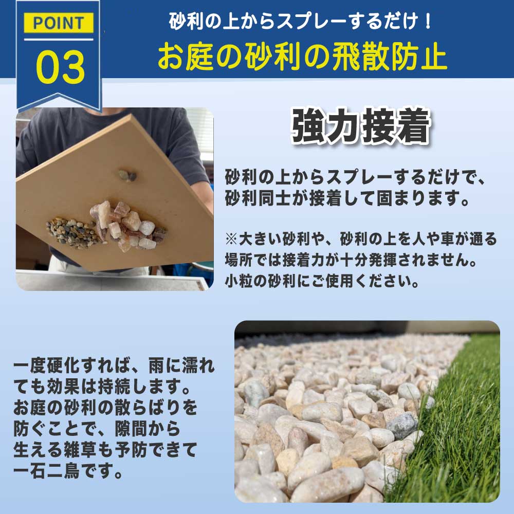 | スプレータイプの工業用接着剤です。アスファルトやセメントなどの硬化を補助したり、剥がれ防止に役立ちます。 ▼アスファルト補修材の表面保護 補修後に吹き付けることで、表面に被膜を形成し、強度が向上。補修材が剥がれにくくなります。 ▼セメント等の接着力強化 下地に吹付することで塗りつけるセメントの接着力を高め、剥がれにくくします。ハケ塗りタイプの接着剤に比べ薄める手間がありません。 ▼スプレーセメントの定着力を向上 スプレーセメントの定着力を強固にして剥がれにくくします。施工後の耐久性も向上します。 ▼セメント等の劣化抑制 セメントの劣化部分に吹き付けると、耐水被膜を形成して耐水効果を発揮します。 ▼砂利の飛散防止 砂利の上からスプレーするだけで表面〜内部に膜を形成し、小粒の砂利を固めます。お庭やお墓の砂利の飛散を防止するだけでなく、雑草の抑制や猫の糞尿対策としても効果的です。※大きい砂利や、砂利の上を人や車が通る場所では接着力が十分発揮されません。小粒の砂利にご使用ください。 |