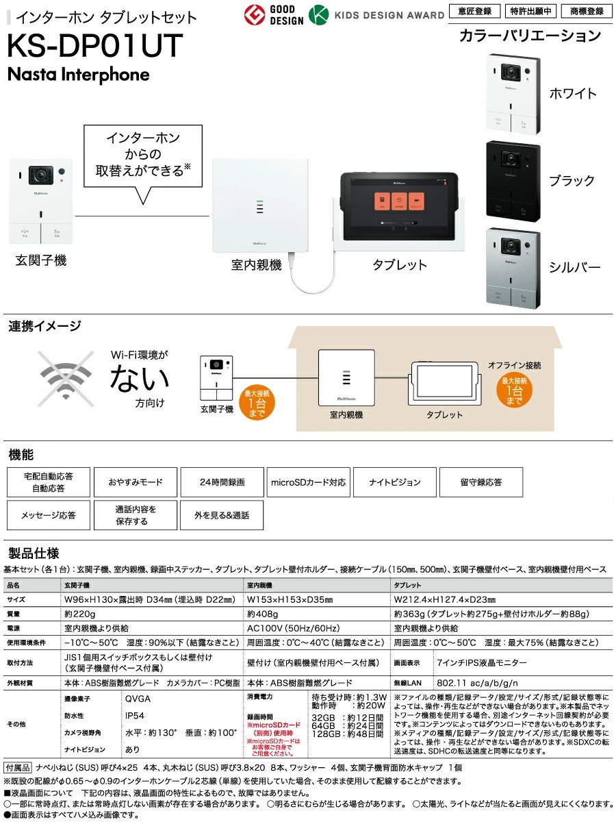 インターホン情報詳細 | 【基本セット(各1台)】 玄関子機、室内親機、録画中ステッカー、タブレット、タブレット壁付ホルダー、接続ケーブル(150mm、500mm)、玄関子機壁付ベース、室内親機壁付用ベース 【玄関子機仕様】 ●サイズ:W96×H130×露出時 D34mm(埋込時 D22mm) ●質量:約220g ●電源:室内親機より供給 ●使用環境条件:−10℃〜 50℃ 湿度:90%以下(結露なきこと) ●取付方法:JIS1個用スイッチボックスもしくは壁付け(玄関子機壁付ベース付属) ●外観材質:本体:ABS樹脂難燃グレード、カメラカバー:PC樹脂 ●撮像素子:QVGA ●防水性:IP54 ●カメラ視野角:水平:約130°、垂直:約100° ●ナイトビジョン:あり 【室内親機仕様】 ●サイズ:W153×H153×D35mm ●質量:約408g ●電源:AC100V(50Hz/60Hz) ●消費電力:待ち受け時:約1.3W、動作時:約20W ●使用環境条件:周囲温度0℃〜 40℃(結露なきこと) ●取付方法:壁付け(室内親機壁付用ベース付属) ●外観材質:本体(ABS樹脂難燃グレード) ●録画時間:32GB(約12日間)、64GB(約24日間)、128GB(約48日間)※ microSDカード(別売)使用時 【付属品】 ●ナベ小ねじ(SUS)呼び4×25:4本 ●丸木ねじ(SUS)呼び3.8×20:8本 ●ワッシャー:4個 ●玄関子機背面防水キャップ:1個 【タブレット仕様】 サイズ:W212.4×H127.4×D23mm 質量:約363g(タブレット約275g+壁付けホルダー約88g) 電源:室内親機より供給 使用環境条件:周囲温度:0℃〜 50℃ 湿度:最大75%(結露なきこと) 画面表示:7インチIPS液晶モニター 無線LAN:802.11 ac/a/b/g/n ※ファイルの種類/記録データ/設定/サイズ/形式/記録状態等によっては、操作・再生などができない場合があります。 ※本製品でネットワーク機能を使用する場合、別途インターネット回線契約が必要です。 ※コンテンツによってはダウンロードできないものもあります。 ※メディアの種類/記録データ/設定/サイズ/形式/記録状態等によっては、操作・再生などができない場合があります。※SDXCの転送速度は、SDHCの転送速度と同等になります。 |