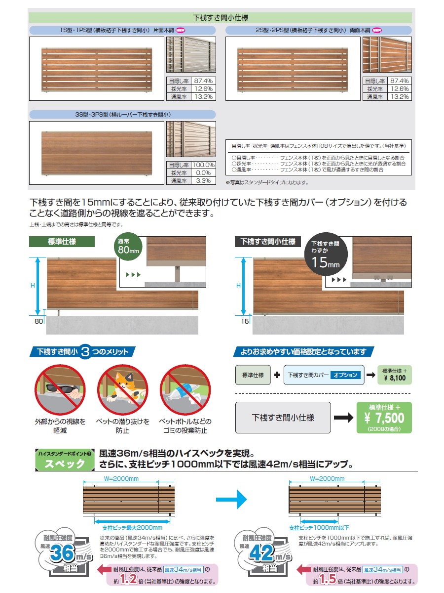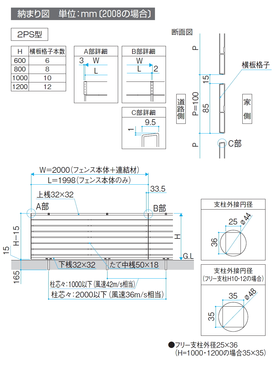 備考 | ●1S,2S,3S型以外とのデザイン違い連結はできません。 ●フェンス連結箇所には、フリー支柱の設置はできません。 ●フリー支柱とフェンス連結部および端部・コーナー部の間隔は、300mm以内で施工してください。それ以上離れると強度が大幅に低下します。 ●コーナー部は、強度確保のため、支柱を2本施工してください。 ●フェンス本体1枚を切断して2枚で使用する場合、「端部カバー」が1組(両端分含む)必要です。 ●1S,2S,3S型の場合下桟すきまカバー(オプション)は取り付けできません。 |