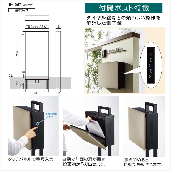 サイズ(mm) | 門柱:W700×H1734(埋め込み部350を含む)×151mm ポスト:W450×H350×D142mm 照明:Φ60×D58mm |