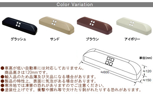 備考 | 接着剤は付属しておりません。 車高が低い自動車には対応しておりません。商品高さは120mmです。 表面は塗装仕上げですので、衝撃や擦れ等により欠けたり剥がれたりする恐れがあります。 製品の特性上、表面に気泡がある場合があります。 寒冷地では凍害の恐れがあります。