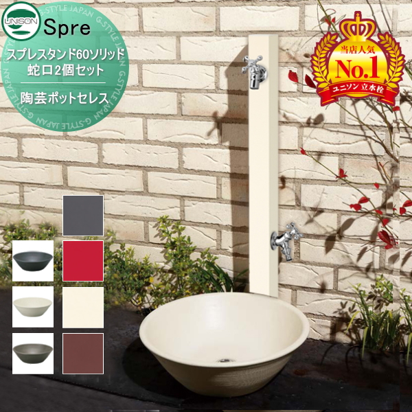 商品名 | 【スプレスタンド60ソリッド 蛇口2個セット+セレスポット】 イメージ 水栓柱:オフホワイト パン:シルクベージュ 蛇口:シルバー おしゃれ かわいい ガーデニング 庭まわり 屋外 水道 水廻り |