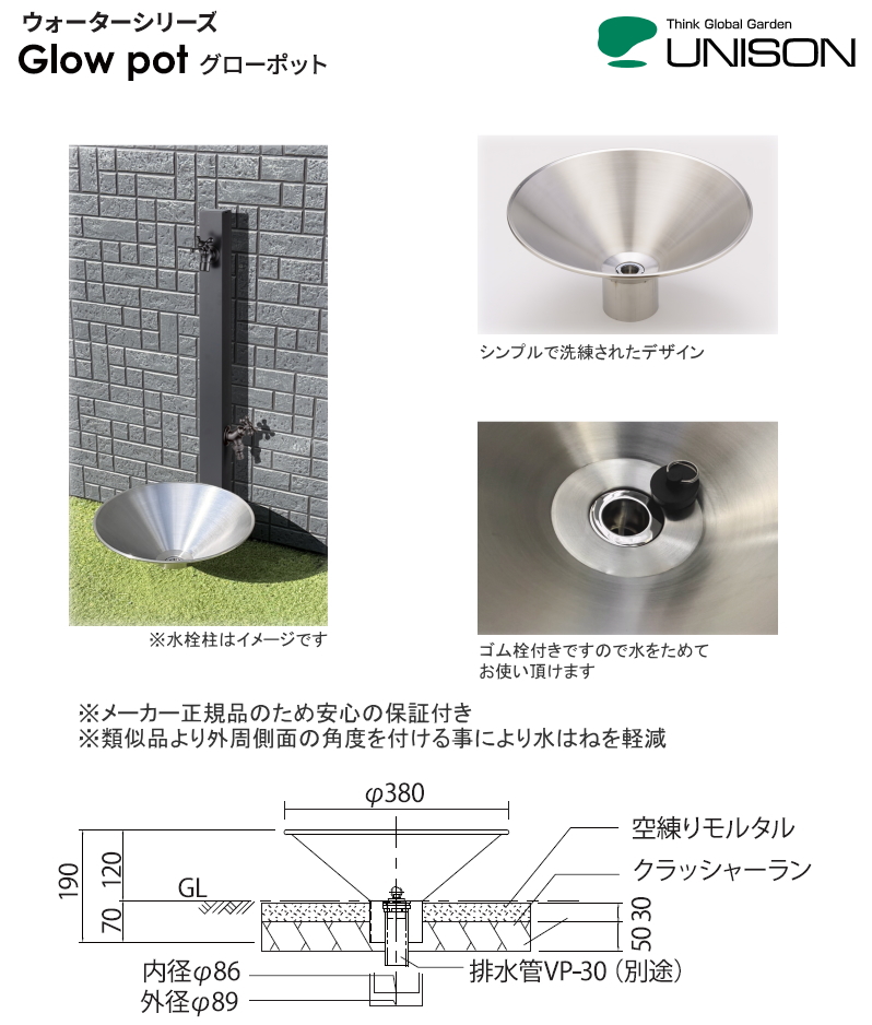 商品名 | 【新発売】ガーデンパン Glow pot(グローポット) ステンレス製 水受け ユニソン×G-STYLE ※メーカー正規品 水はね改善 おしゃれ 立水栓 水栓柱用 水栓パン ガーデニング 庭まわり 屋外 シンプル かわいい 新築 リフォーム |