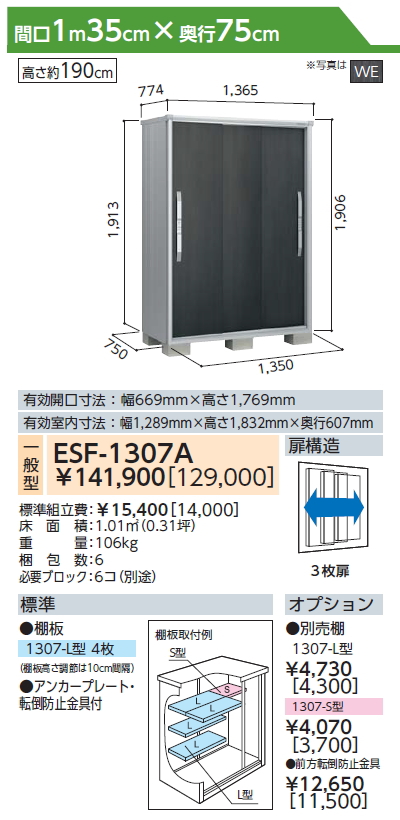 商品名 | 【訳ありアウトレット品】 物置 収納 エスモ 一般型 ESF-1307A サイズ:約 幅135cm×奥行75cm×高さ190cm ウッディココア(WC)・ウッディエボニー(WE) ヨドコウ ヨド物置 淀川製鋼 収納庫 屋外 小型物置 倉庫 |