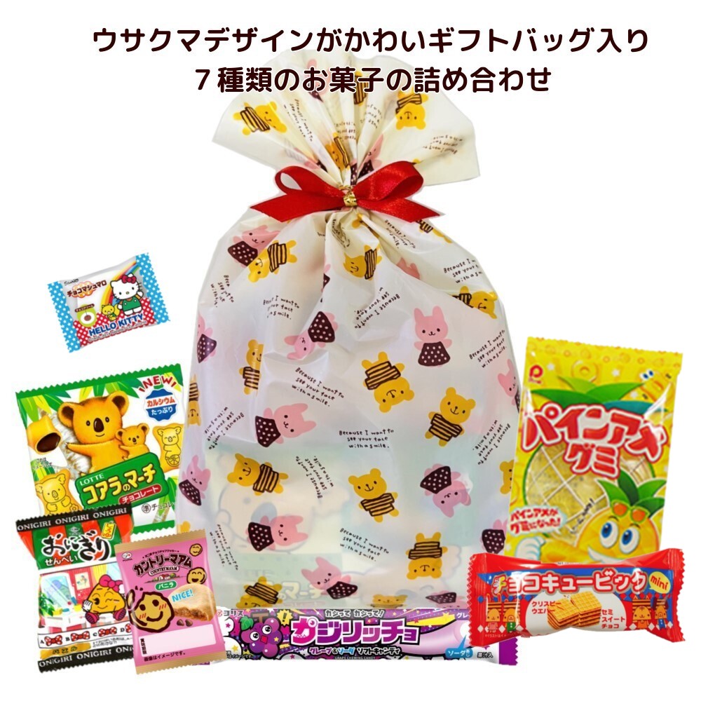 ちいさなうさぎとくまのデザイン袋に、人気のお菓子を7種類詰め合わせました。