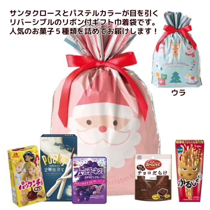 可愛らしい表情のサンタクロースとパステルカラーが目を引くリバーシブルのクリスマスリボン付ギフト巾着袋です。